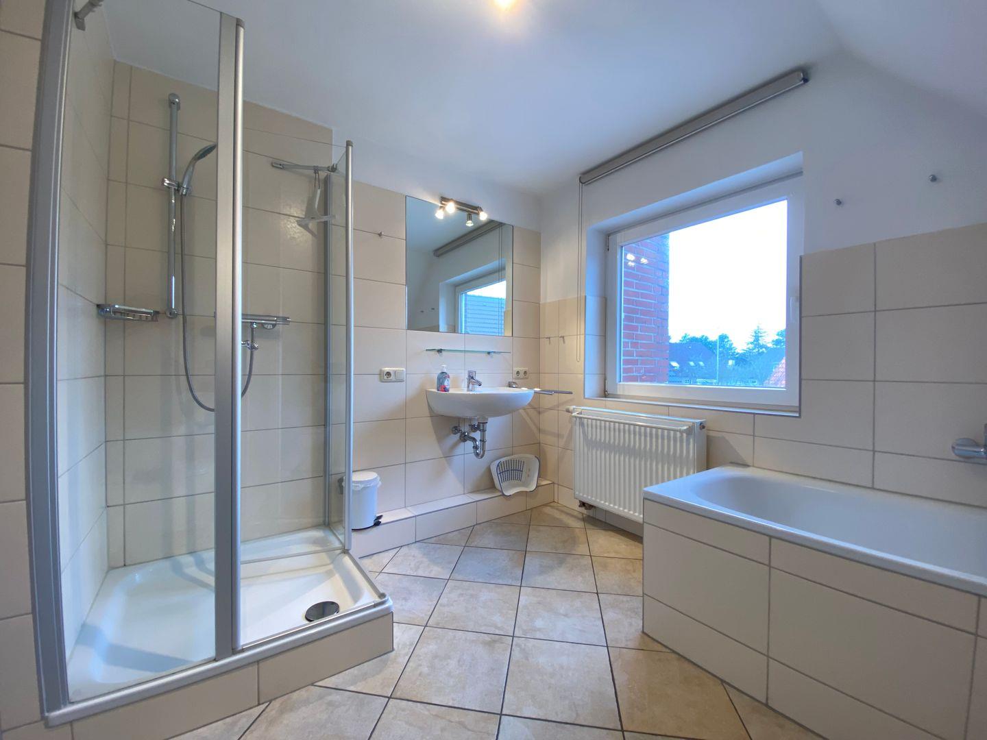 Neben der Gästetoilette im Erdgeschoss befindet sich im Obergeschoss ein Bad mit Wanne und Dusche sowie einem weiteren WC.