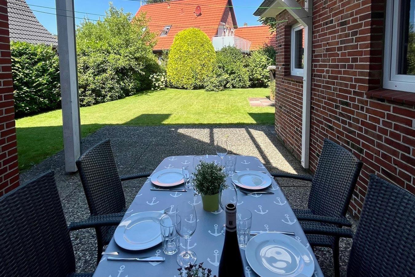 Entspannen Sie auf der Terrasse vor dem Haus mit Gartenmöbeln oder im Strandkorb auf dem Rasen hinter dem Haus und lassen Sie den Tag gemütlich ausklingen.