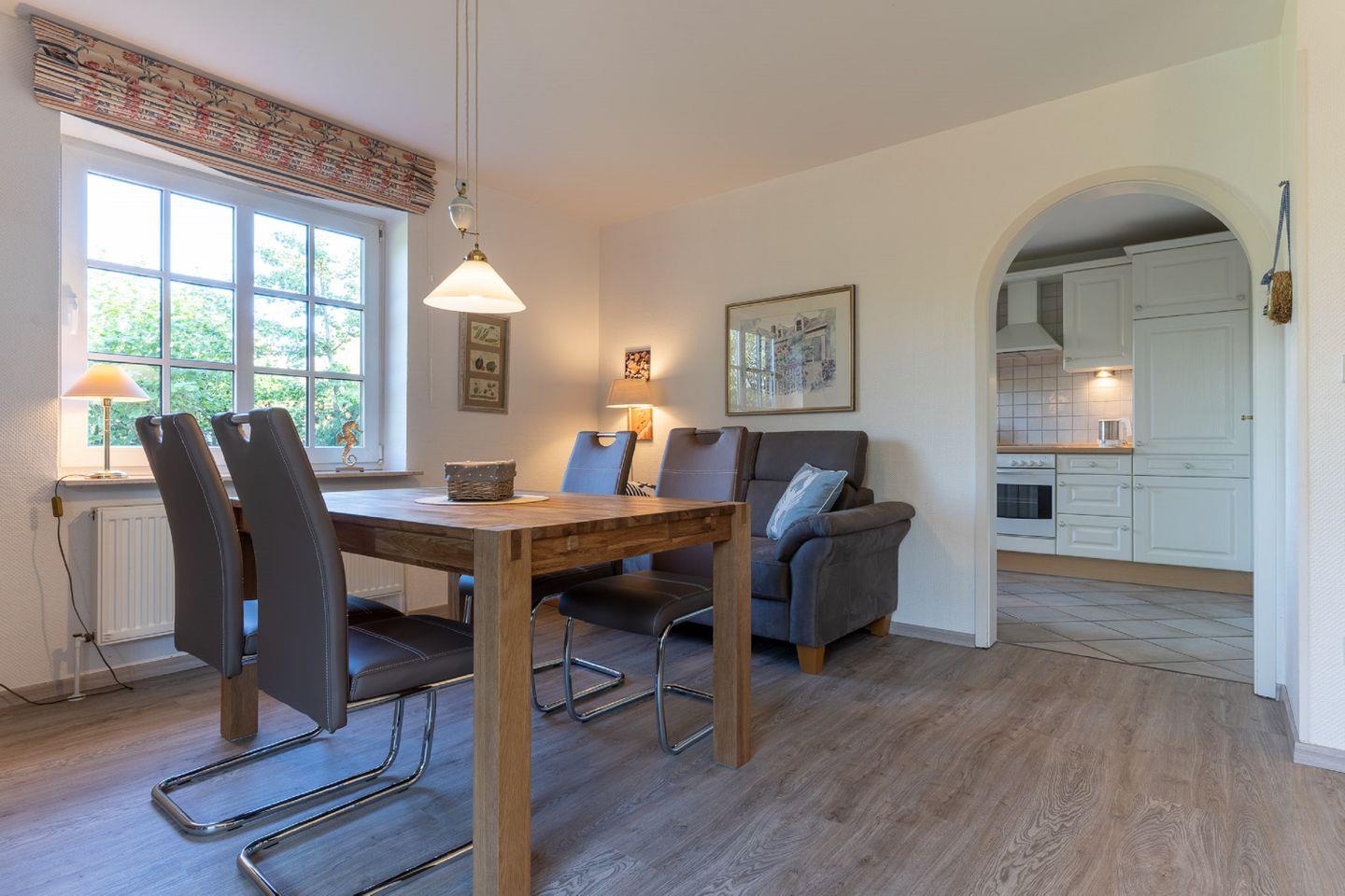 Im Erdgeschoss befindet sich das helle und lichtdurchflutete Wohnzimmer mit Essecke. Die separate Küche ist unter anderem mit einem Geschirrspüler und einer Mikrowelle gut ausgestattet.