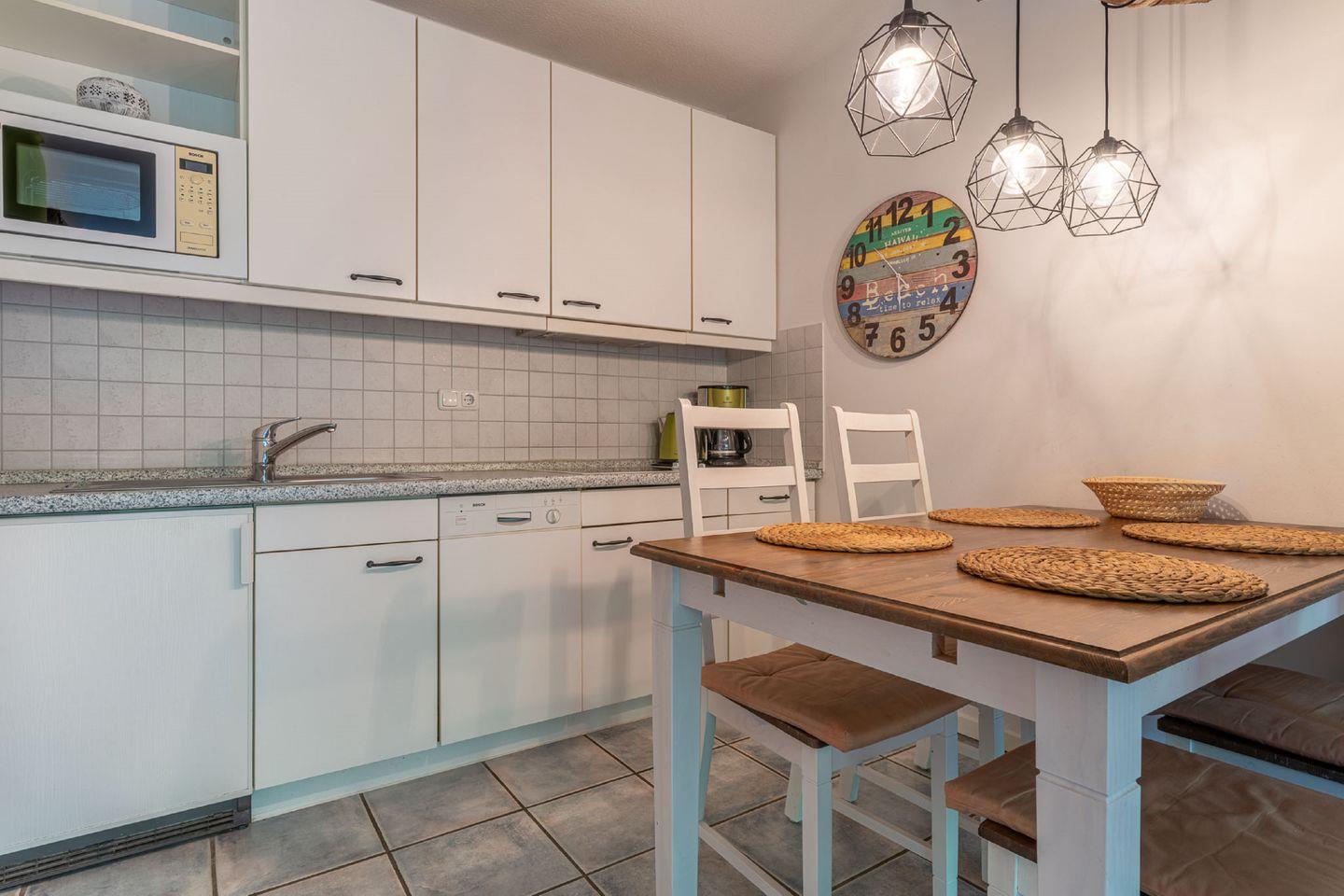 Der helle Wohnraum mit Essecke lädt zum Verweilen ein, und selbstverständlich ist WLAN vorhanden. Der Essbereich bildet eine optische Trennung zur offenen Küche, die unter anderem mit einem Geschirrspüler und einer Mikrowelle ausgestattet ist.