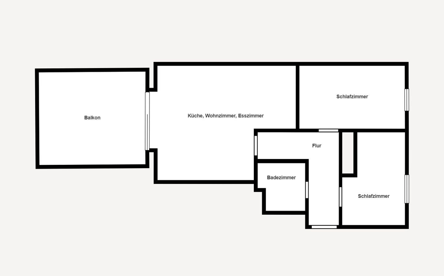 Die Raumaufteilung umfasst einen Wohnraum mit offener Küche, 2 Schlafräume (1 Boxspringbett, 2 Einzelbetten) und ein Duschbad/WC.