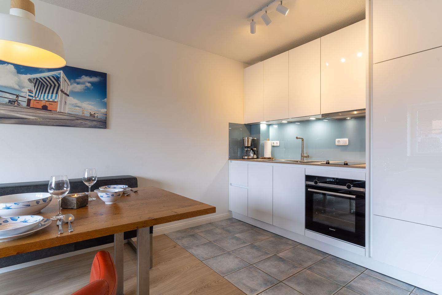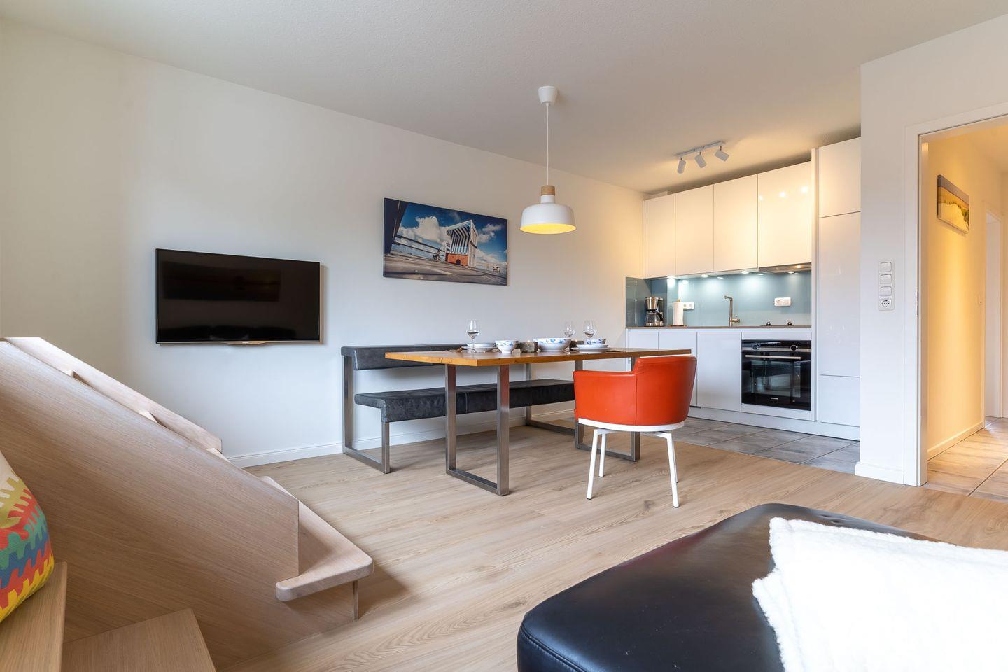 Im großzügigen Wohnraum mit integrierter Essecke können Sie sich nach einem ereignisreichen Tag herrlich entspannen. WLAN ist selbstverständlich vorhanden. Die moderne offene Küche (Stand 2023) überzeugt mit Annehmlichkeiten wie einem Geschirrspüler und einem 2er-Ceranfeld mit Backofen.