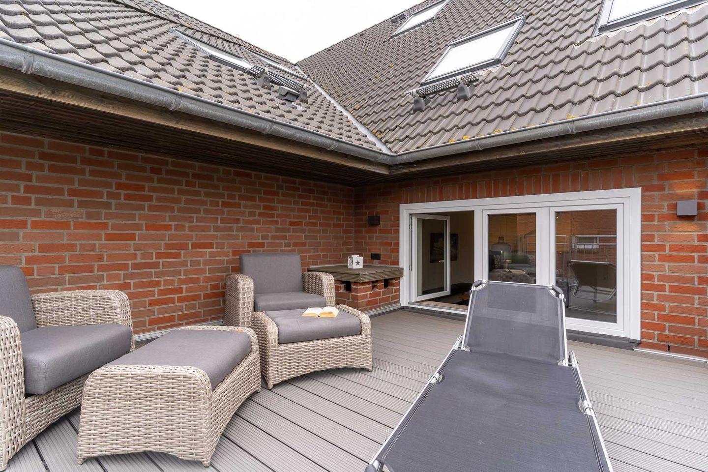 Die großzügige Sonnenterrasse in südlicher Ausrichtung ist aufgrund der niedrigen Durchgangshöhe eingeschränkt begehbar.