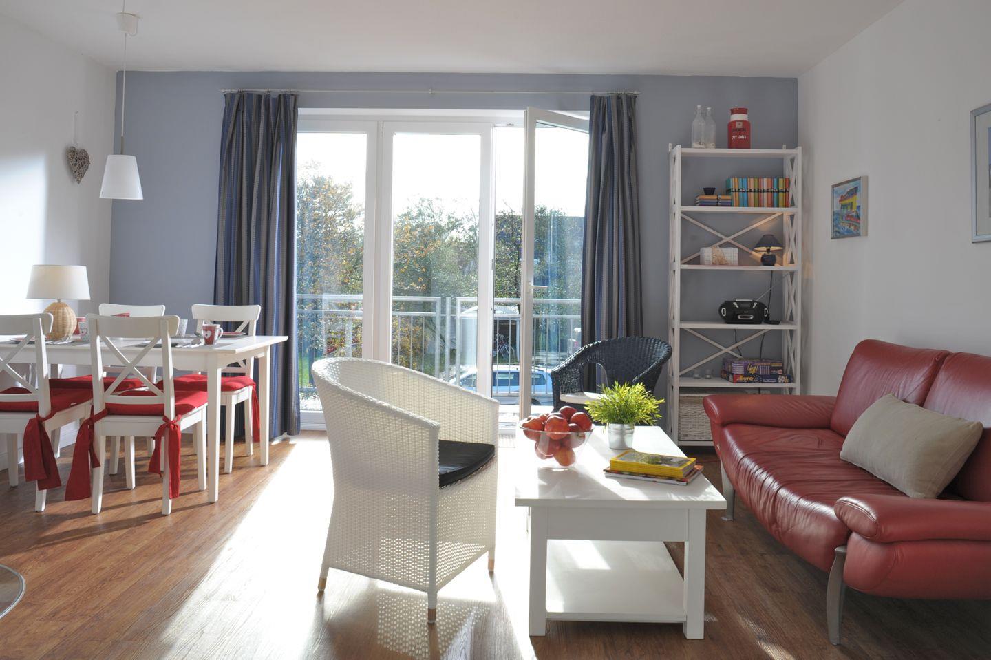 Der Wohnbereich besticht durch einen Kamin und den Zugang zum Balkon mit Gartenmöbeln. Die Essecke im Wohnbereich wirkt freundlich durch liebevolle Details.