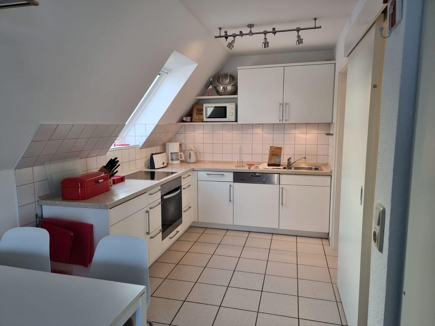 Die gut ausgestattete Küche macht das Kochen zu einem Vergnügen. Neben einem Geschirrspüler stehen Annehmlichkeiten wie Backofen, Eierkocher, Waffeleisen und Kaffeemaschine zur Verfügung.