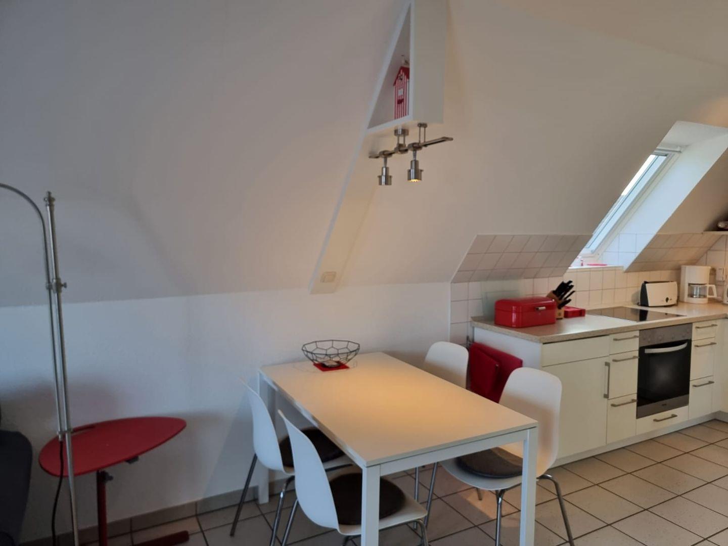 Die helle Dachgeschosswohnung erstreckt sich über ca. 50 m² Wohnfläche und schafft eine gemütliche Wohnatmosphäre, ideal für Ihren Urlaub. Ein Kamin im lichtdurchfluteten Wohnbereich sorgt für kuschelige Wärme in der kalten Jahreszeit.
