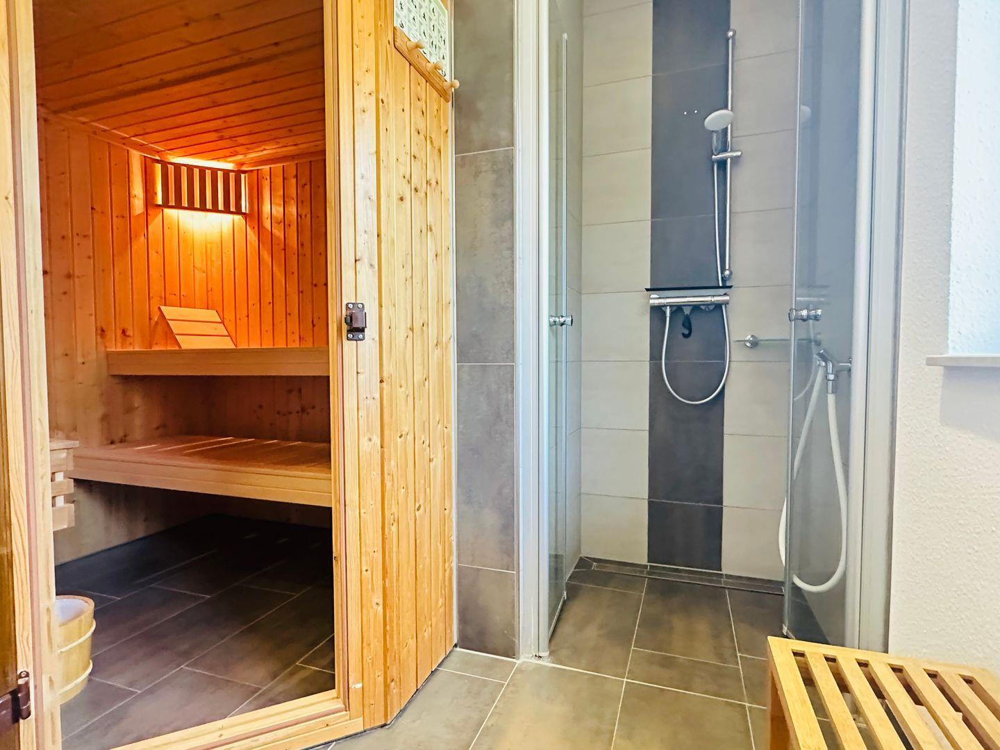 Im Erdgeschoss erwartet Sie ein großzügiger Wohn- und Essbereich mit offener Küche, Kaminofen und angenehmer Fußbodenheizung – perfekt für gemütliche Stunden. Ebenfalls auf dieser Etage befindet sich ein Duschbad mit integrierter Sauna sowie ein Hauswirtschaftsraum mit Waschmaschine und Trockner.