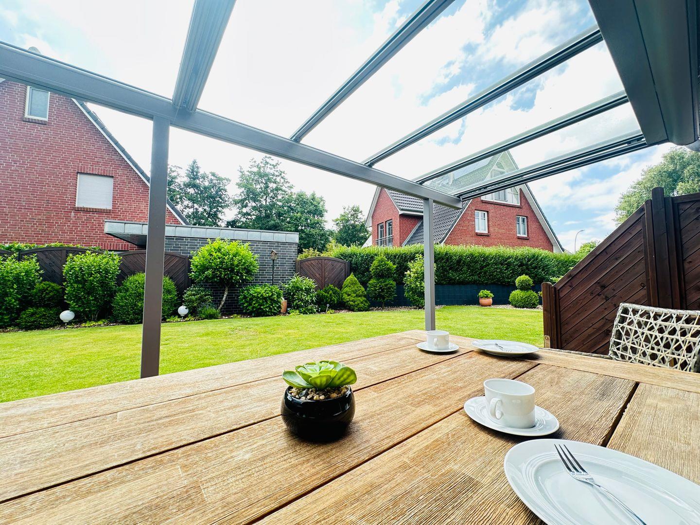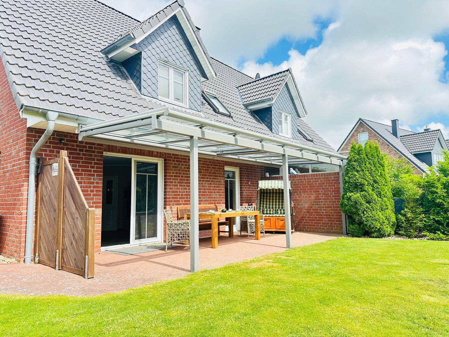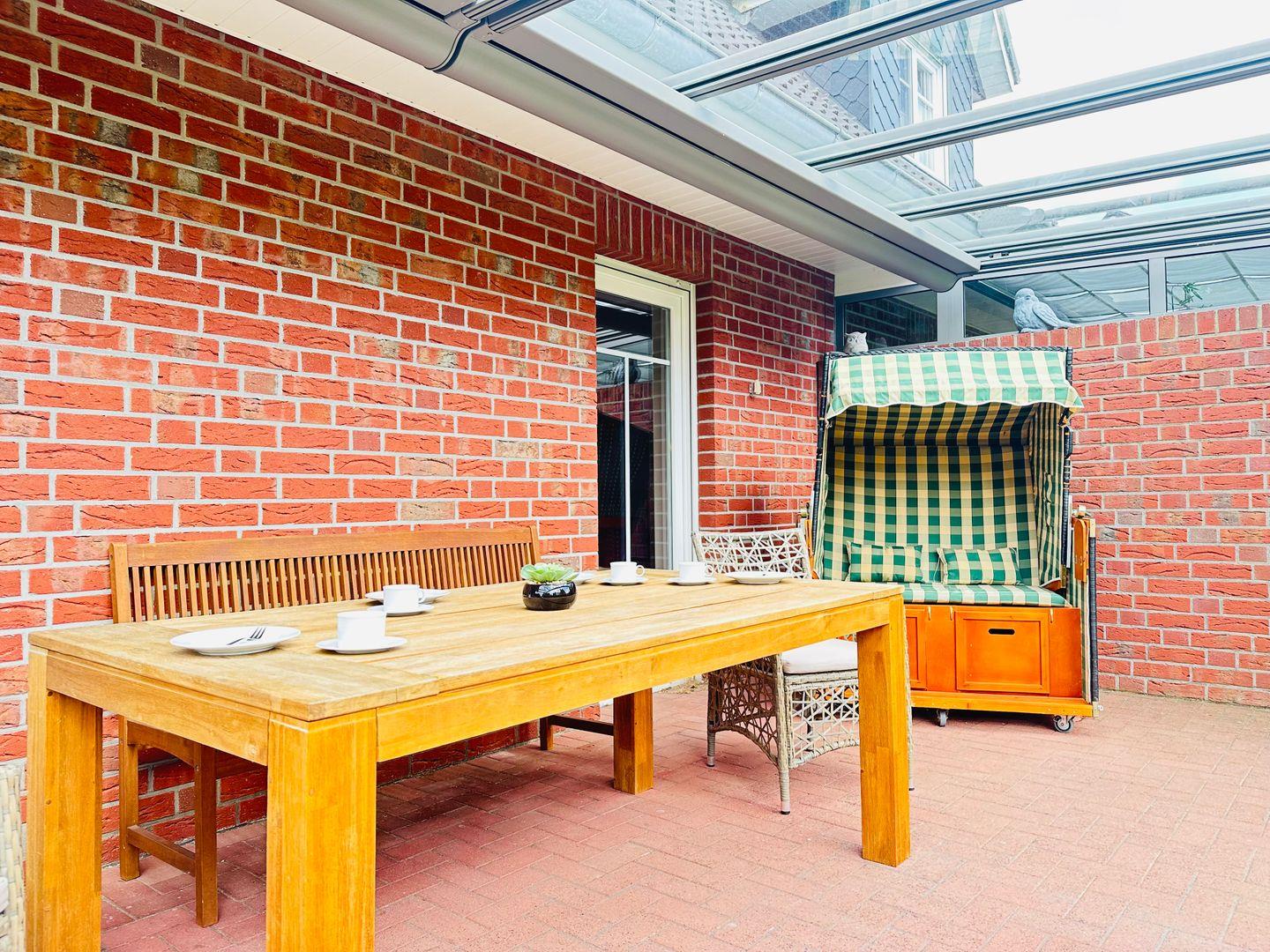 Der liebevoll angelegte Garten bietet viel Platz und lädt zum Verweilen ein. Auf der glasüberdachten Terrasse mit hochwertigen Gartenmöbeln und einem Strandkorb genießen Sie sonnige wie auch wettergeschützte Stunden im Freien. Hier können sie auch ihre Fahrräder sicher abstellen.