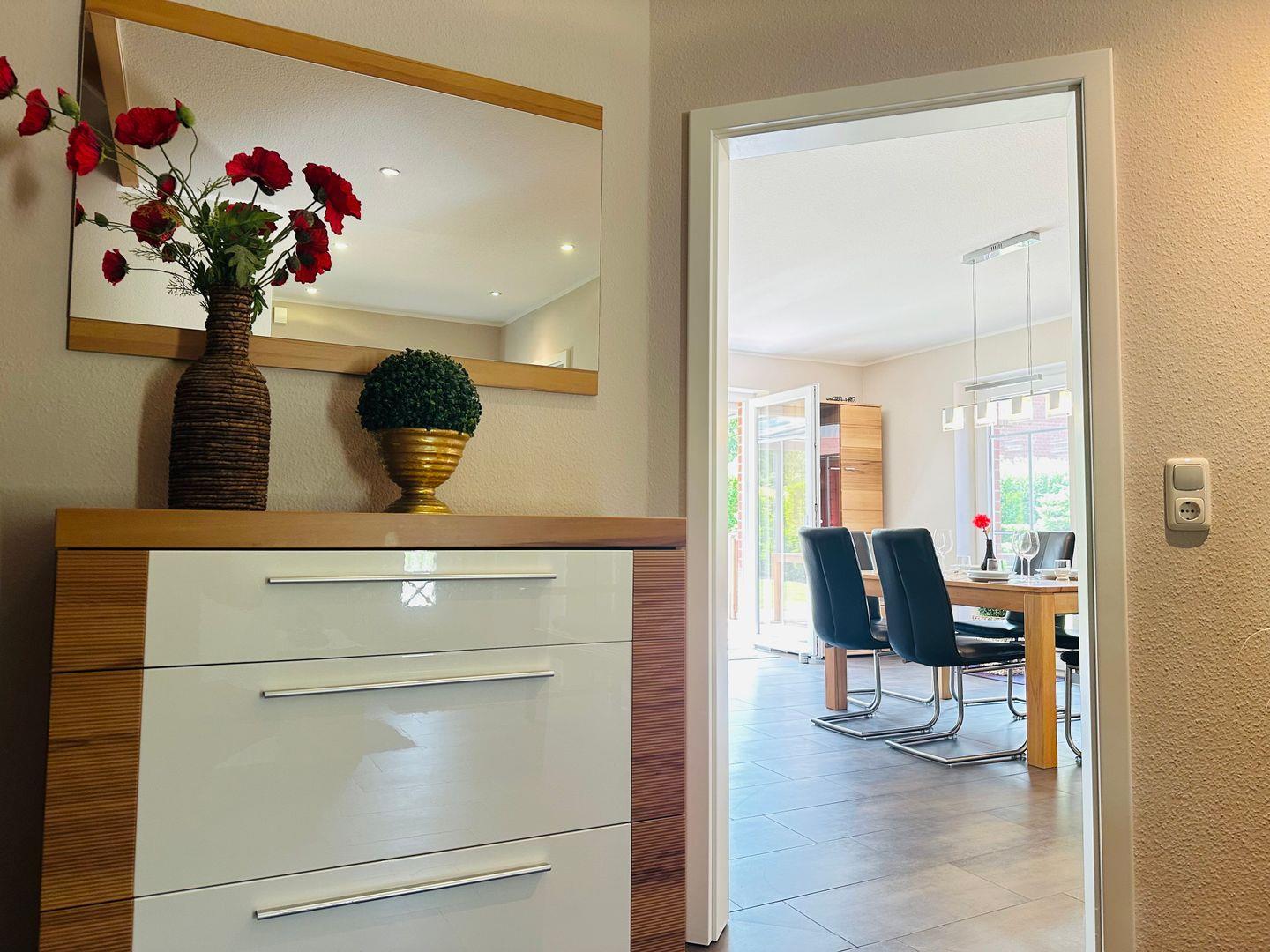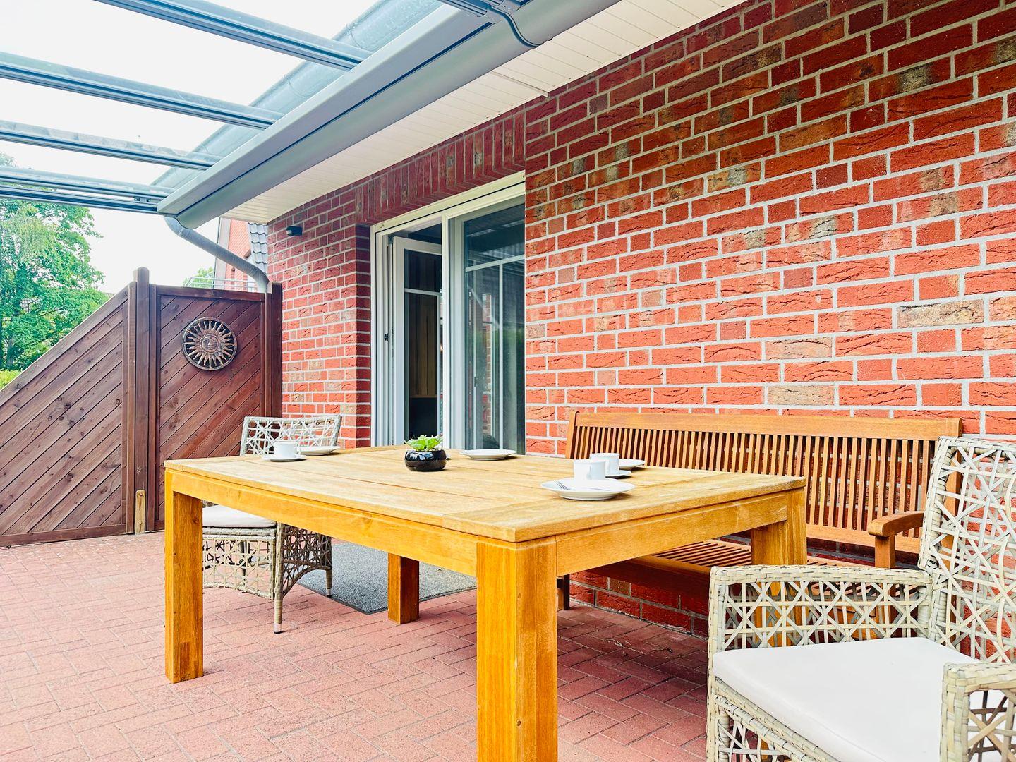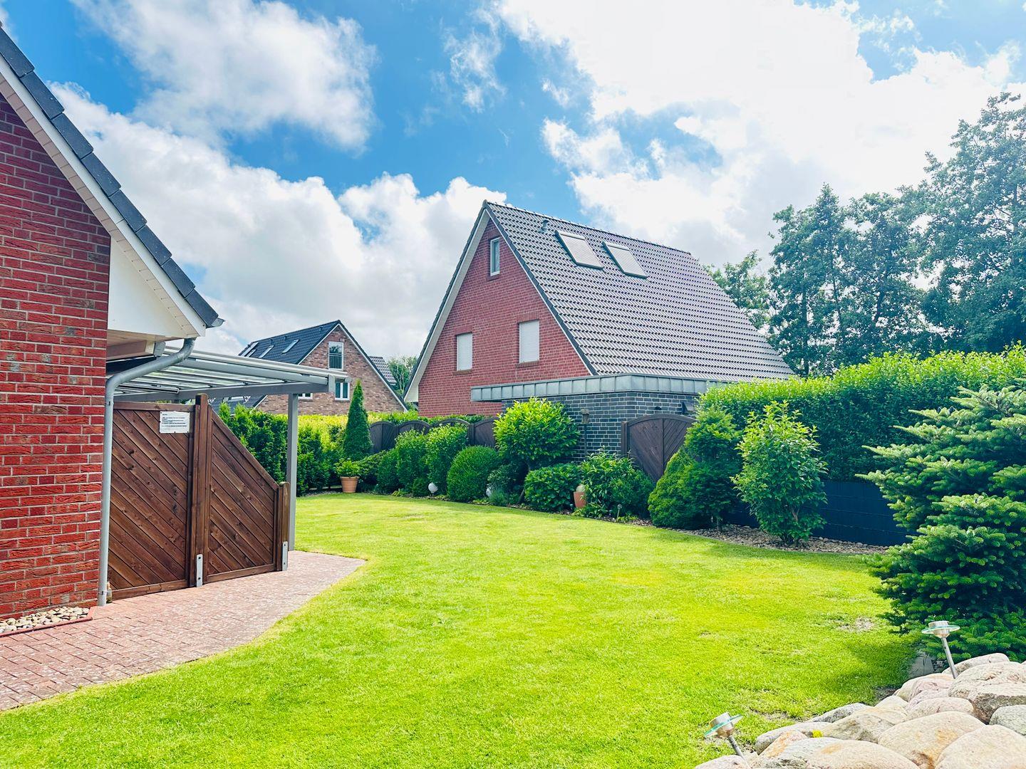 Der liebevoll angelegte Garten bietet viel Platz und lädt zum Verweilen ein. Auf der glasüberdachten Terrasse mit hochwertigen Gartenmöbeln und einem Strandkorb genießen Sie sonnige wie auch wettergeschützte Stunden im Freien. Hier können sie auch ihre Fahrräder sicher abstellen.