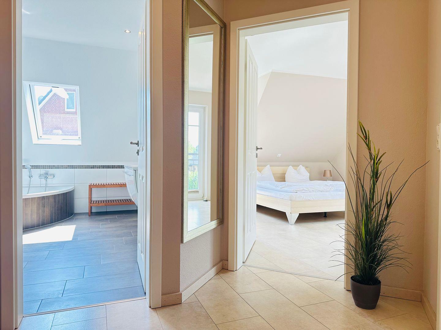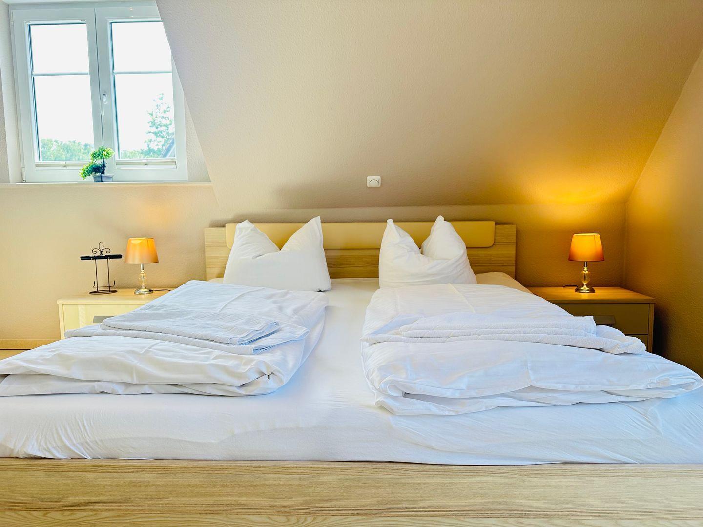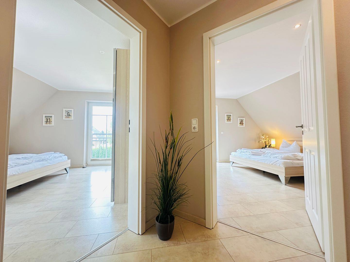 Im Obergeschoss befinden sich zwei komfortable Schlafzimmer, jeweils mit Außenrollläden, großem Kleiderschrank und eigenem Fernseher. Das zweite Bad ist mit Dusche und einer großzügigen Badewanne ausgestattet – ideal zum Entspannen.