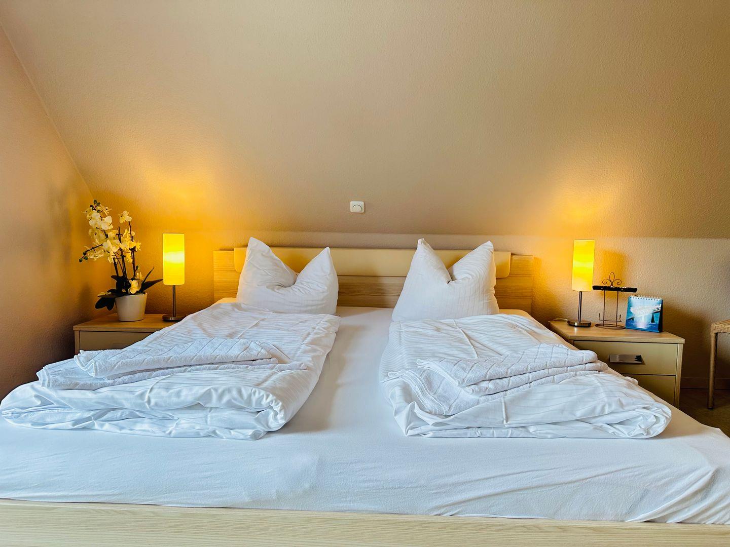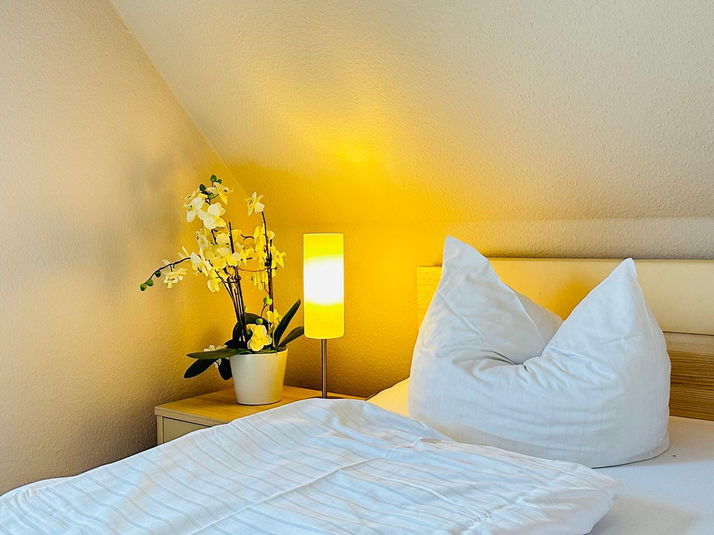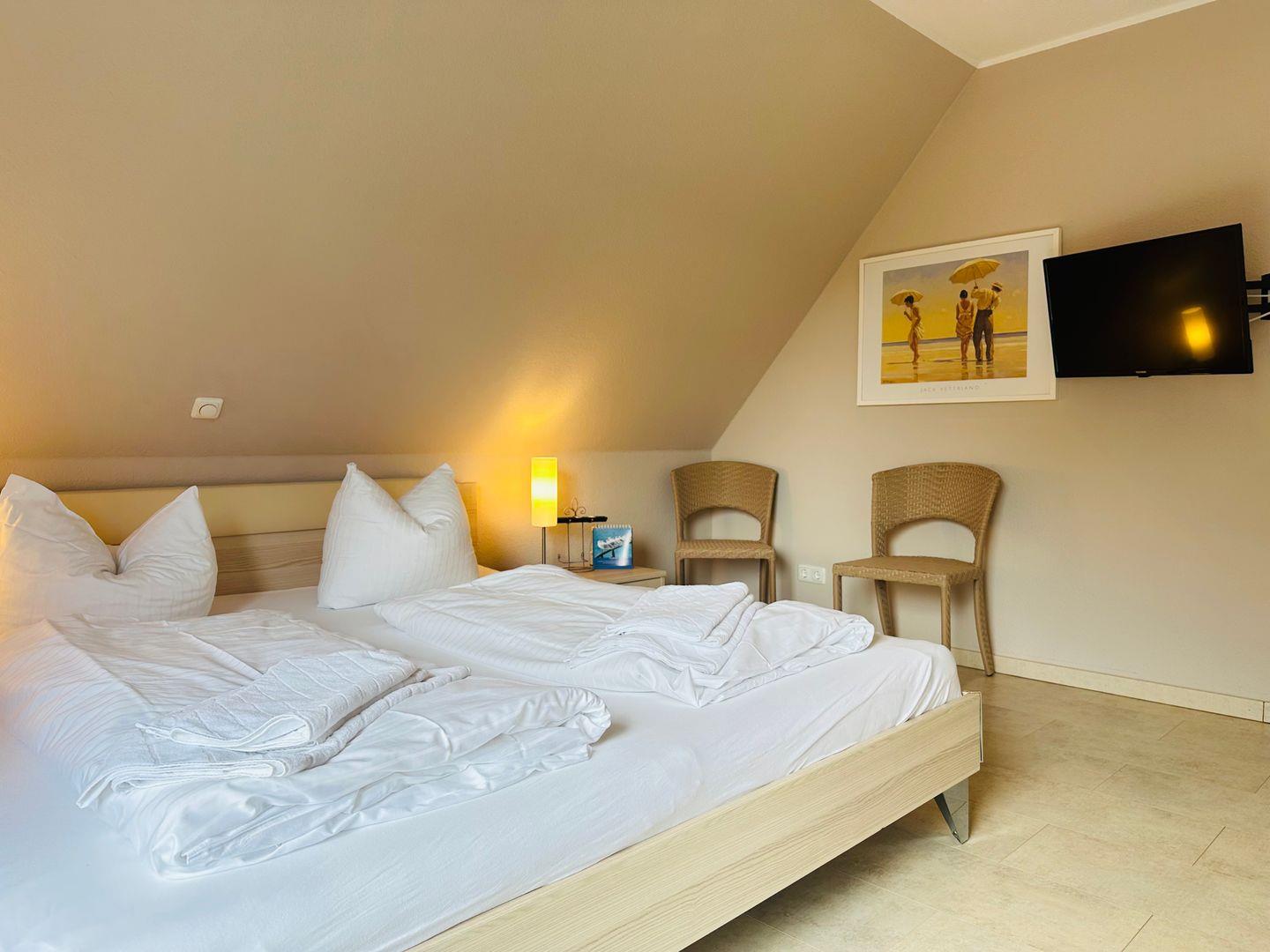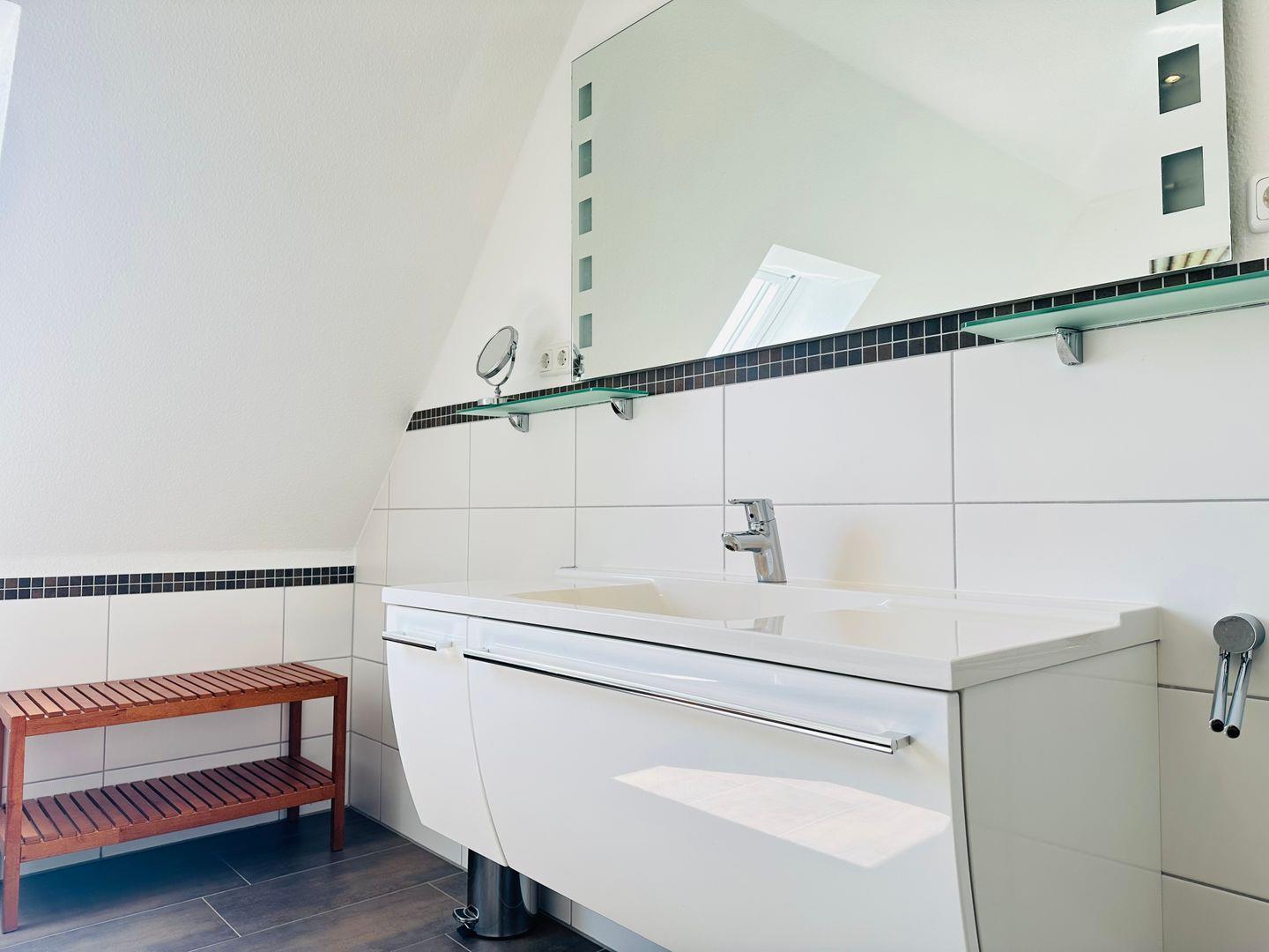 Im Obergeschoss befinden sich zwei komfortable Schlafzimmer, jeweils mit Außenrollläden, großem Kleiderschrank und eigenem Fernseher. Das zweite Bad ist mit Dusche und einer großzügigen Badewanne ausgestattet – ideal zum Entspannen.