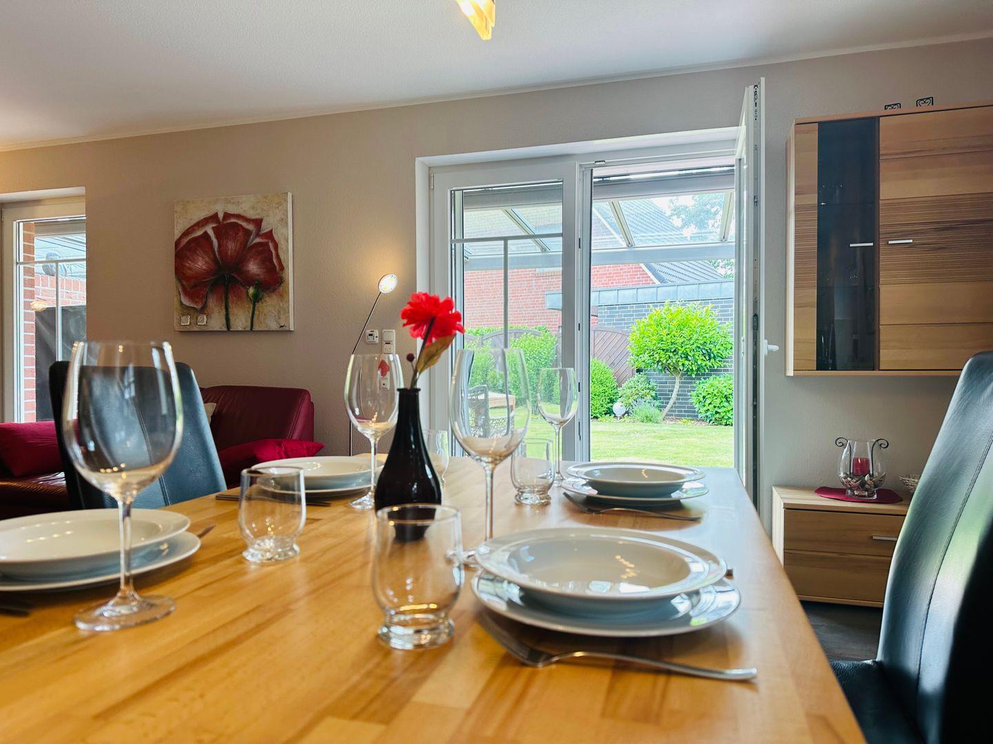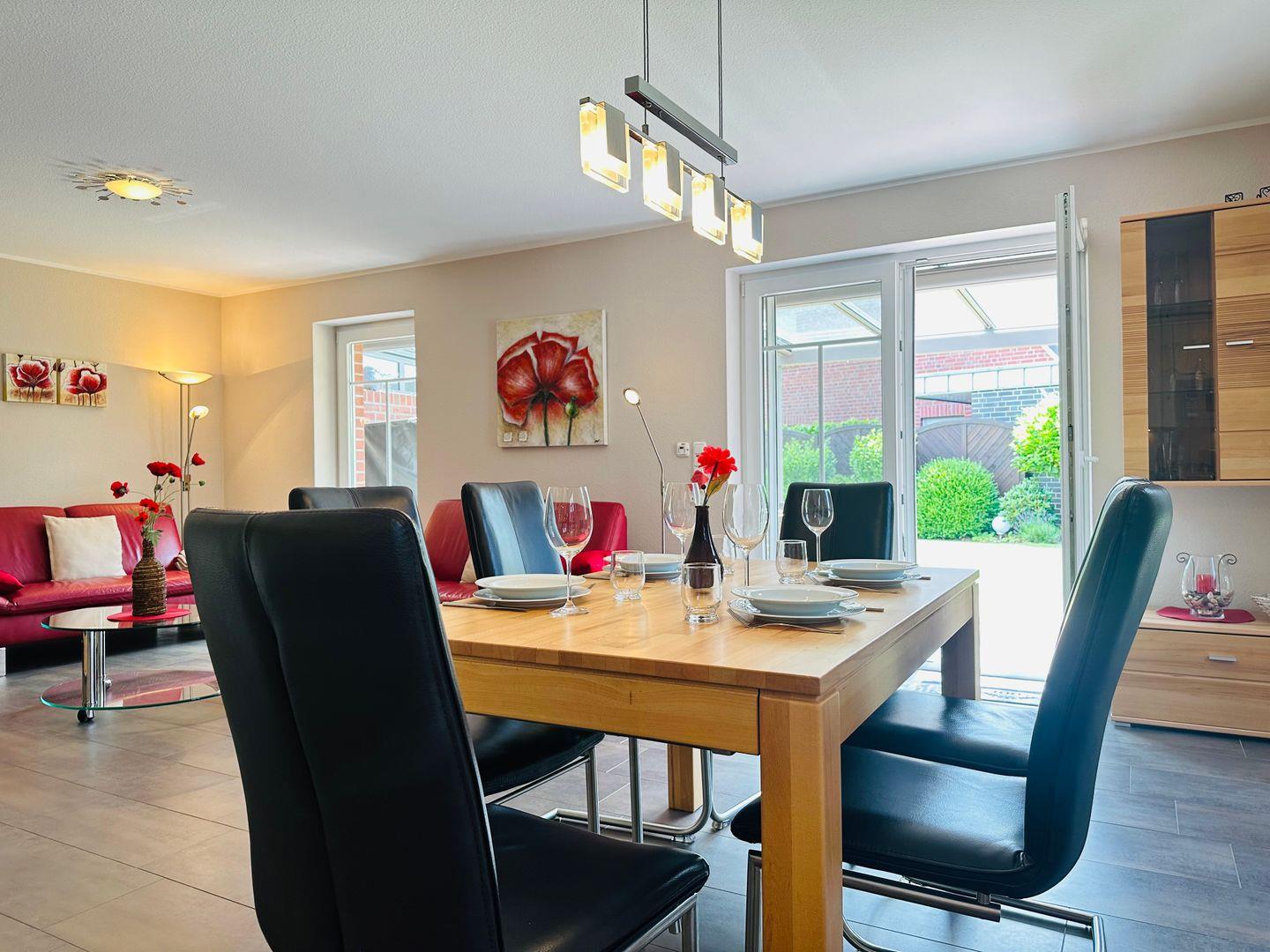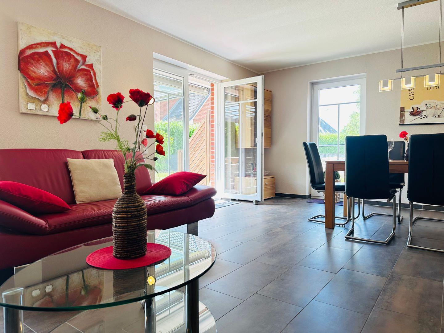 Zentral in St. Peter-Ording Bad liegt die Doppelhaushälfte "Haus bi de Dün". Das Badzentrum mit der Kurpromenade, Einkaufsmöglichkeiten und Cafés/Restaurants erreichen Sie durch den Kurwald in ca. 15 Gehminuten. Im Erdgeschoss erwartet Sie ein heller Wohn- und Essbereich mit einem Kaminofen sowie eine offene moderne Küche mit Backofen, Mikrowelle und Geschirrspüler. Zusätzlich gibt es ein Gästebad mit Dusche und Sauna sowie einen Hauswirtschaftsraum mit Waschmaschine und Trockner. Im ersten Stock befinden sich zwei Schlafzimmer, jeweils mit einem Doppelbett (180x200), und ein Bad mit Dusche und Wanne. Das gesamte Haus verfügt über Fußbodenheizung und Außenrolladen. Zur Ausstattung gehören ein großer LCD-Fernseher, Internet, Stereoanlage etc. Das Haus bietet ein großes Gartengrundstück mit einer glasüberdachten Terrasse und Gartenmöbeln. Ein PKW-Stellplatz befindet sich vor dem Haus. Haustiere sind nicht erlaubt, und es handelt sich um ein Nichtraucherhaus. Das Laden von elektrisch betriebenen PKWs oder Hybridfahrzeugen sowie das Einstellen von Wohnwagen und Wohnmobilen mit Anschluss an den Hausstrom ist ohne ausdrückliche Absprache mit dem Eigentümer nicht zulässig.