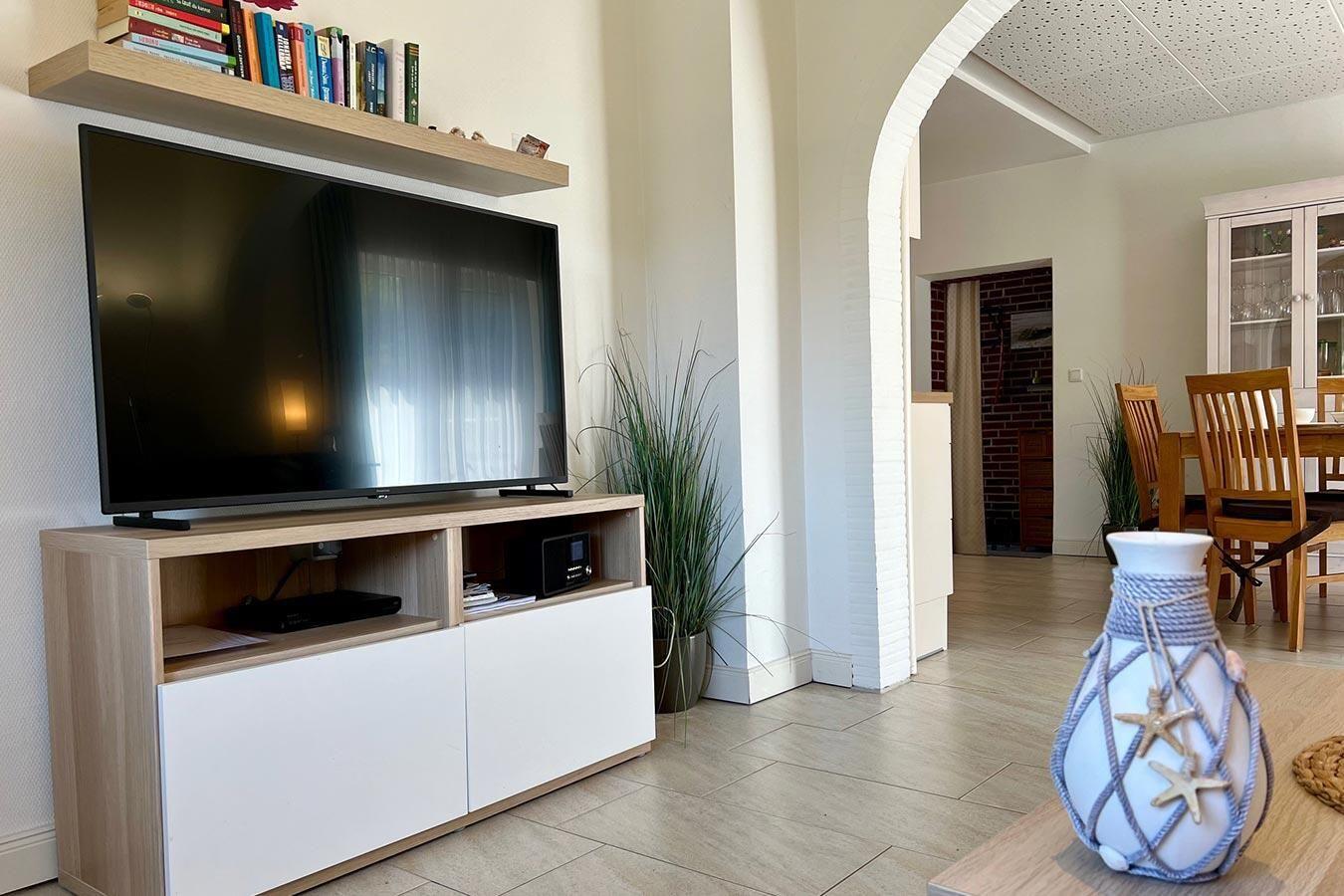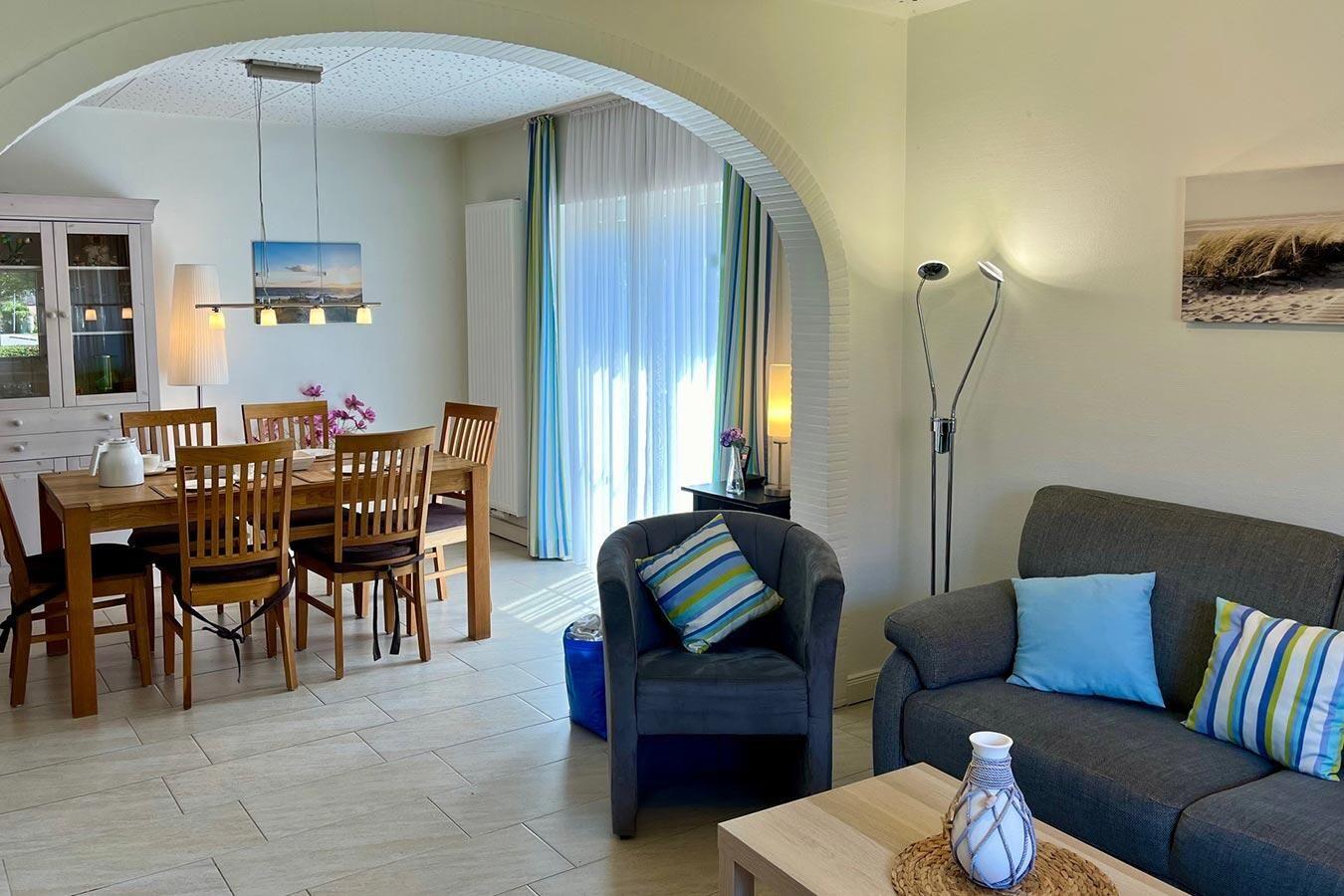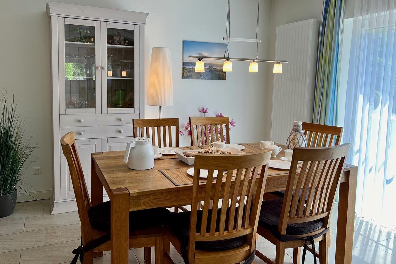 Innen ist das Haus bequem und modern eingerichtet. Vom Essbereich führt eine Tür auf die sonnige Terrasse neben dem Haus.