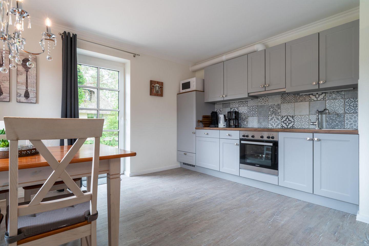 Mit einer Größe von ungefähr 80 qm, verteilt auf zwei Etagen, ist das Haus im hochwertigen Landhausstil eingerichtet. Der Wohnraum mit Essecke wird durch einen Kamin besonders gemütlich. WLAN und eine HiFi-Anlage stehen zur Verfügung.