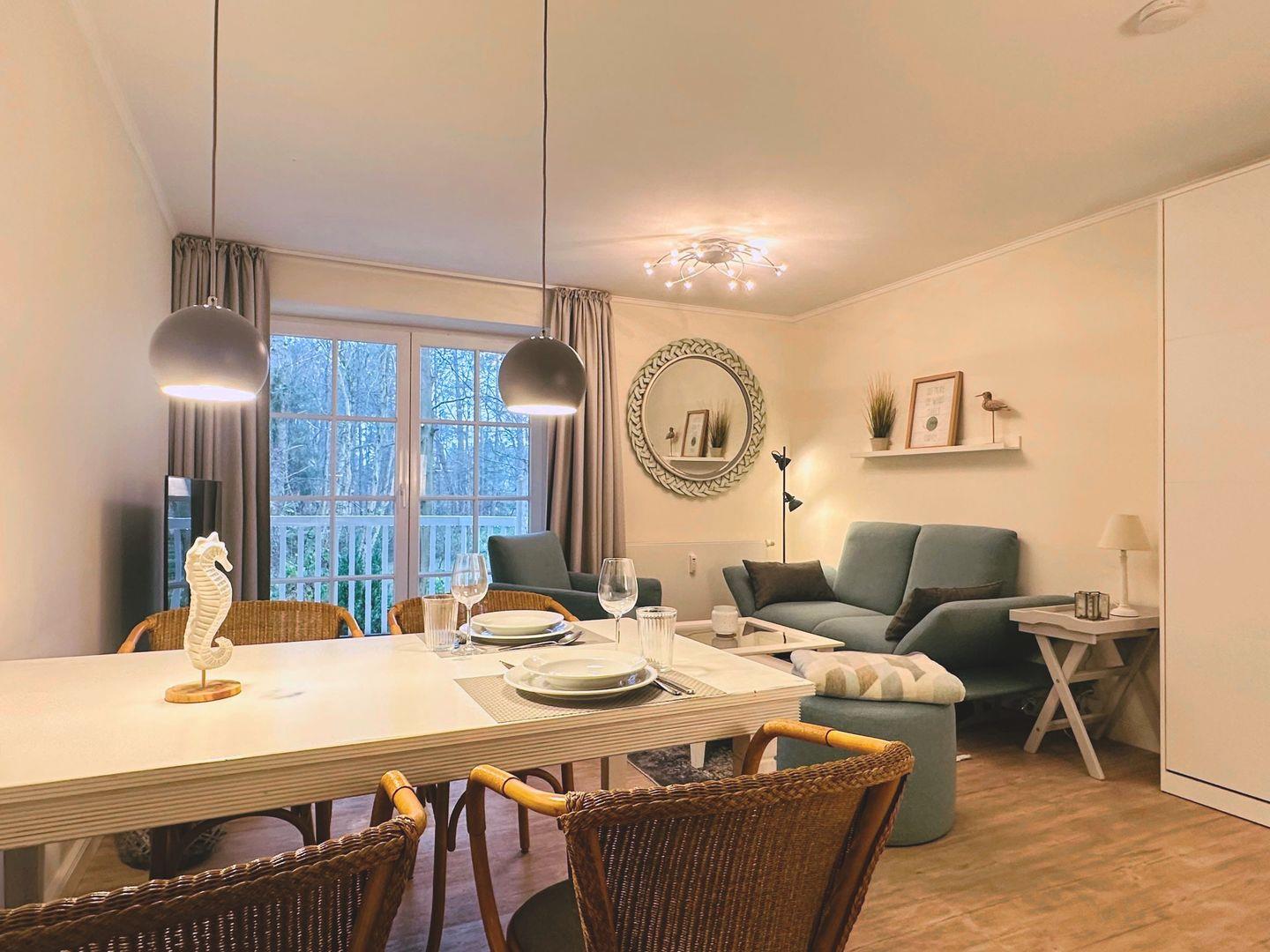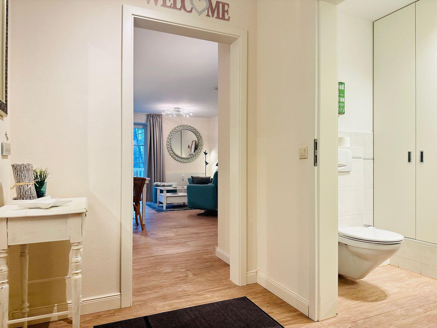 Die ca. 62 qm große Ferienwohnung im Erdgeschoss ist modern und hochwertig eingerichtet. Im Wohnbereich mit Essecke können Sie nach einem langen Tag entspannen. Die offene Küche macht das Kochen zum Vergnügen. Die Wohnung verfügt über ein Duschbad, ein weiteres WC mit Waschtisch und ein Schlafzimmer.