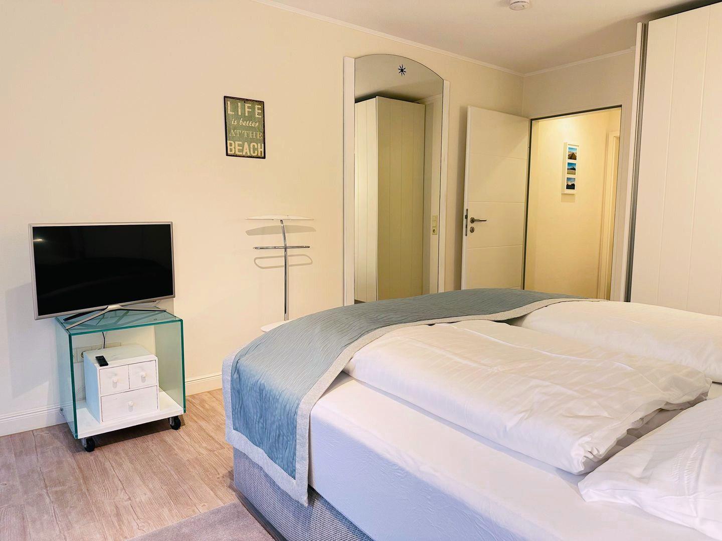 Das Schlafzimmer ist mit einem hochwertigen Boxspringbett ausgestattet, inklusive Bettwäsche und einem TV. Im Wohnzimmer befindet sich ein Schrankbett, das Platz für eine dritte Person bietet.