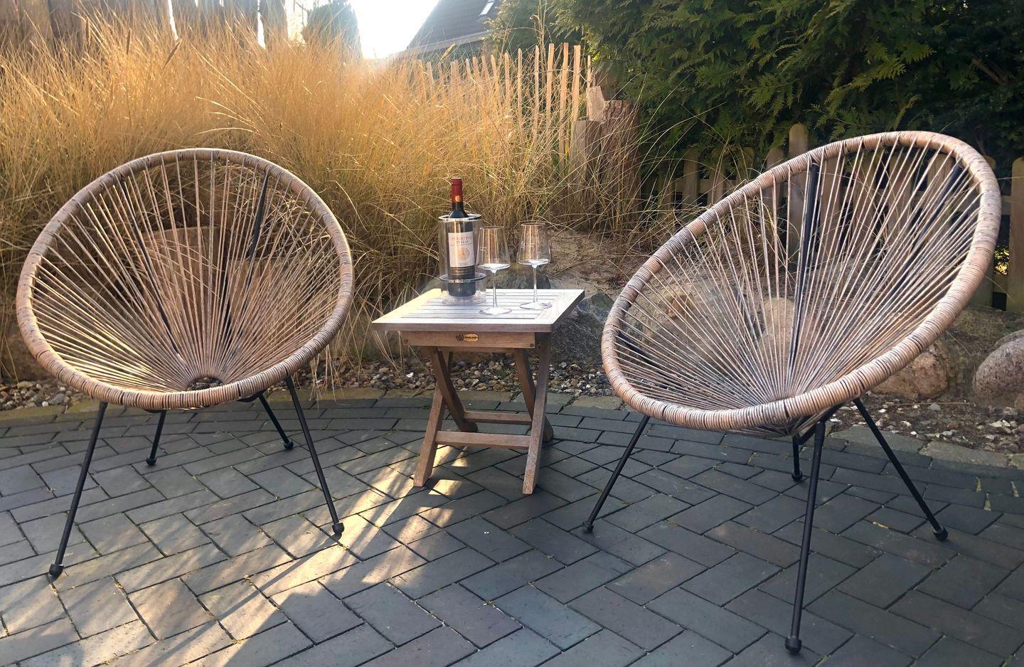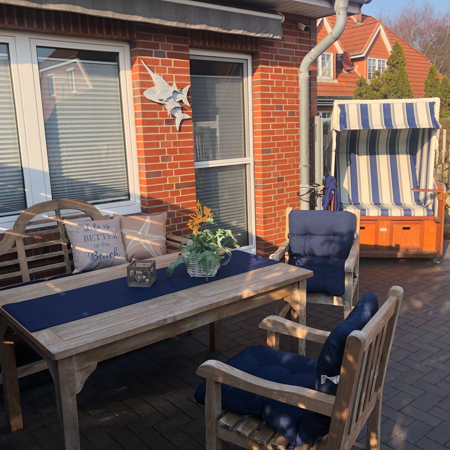 Hier finden Sie neben Gartenmöbeln aus Teakholz auch Deckchairs und einen Strandkorb. Unter der Markise haben Sie im Sommer einen angenehmen Schattenplatz.