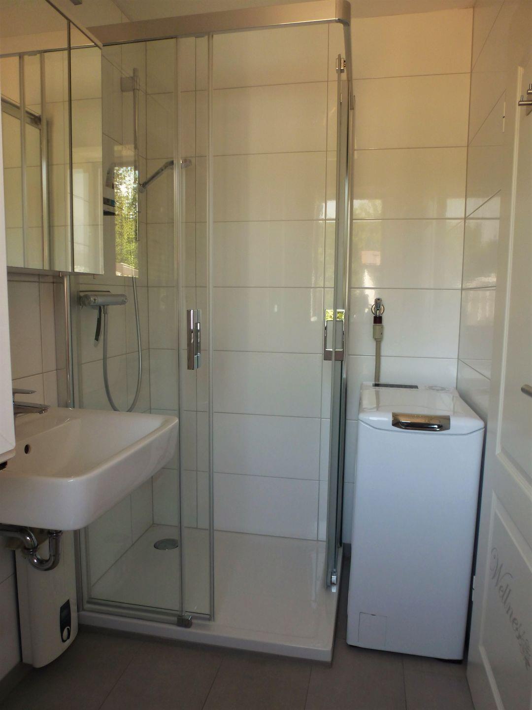 Im komfortabel ausgestatteten Tageslichtbad bieten eine breite Dusche, Haartrockner und eine Waschmaschine alle Annehmlichkeiten.