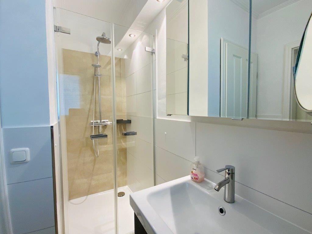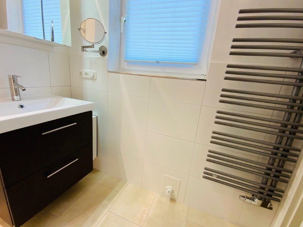 Das Badezimmer verfügt über eine bodennahe Dusche, Fußbodenheizung und eine Waschmaschine.
