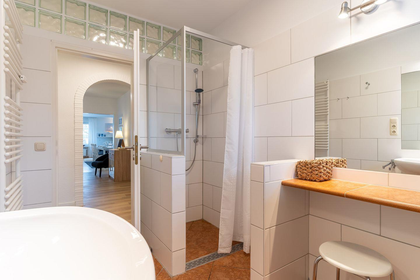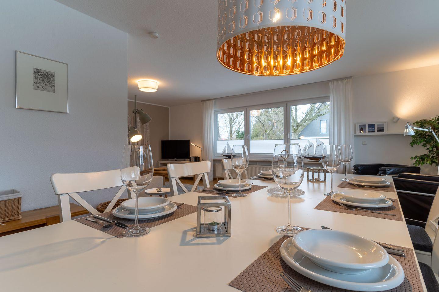 97 qm Erdgeschosswohnung "Seeschwalbe" im Haus Sonnenwinkel für 4 Personen. Großer Wohn- und Essbereich, separate Küche, 2 Duschbäder/WC. 2 Schlafzimmer (1 Doppelbett 180x200 cm, 2 Einzelbetten).