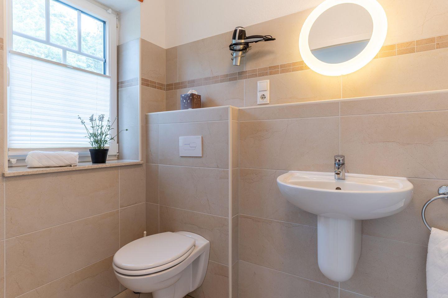 In jedem der beiden Etagen gibt es ein Bad mit ebenerdiger Dusche und WC. Das gesamte Haus ist gefliest und mit Fußbodenheizung ausgestattet. WLAN ist vorhanden.