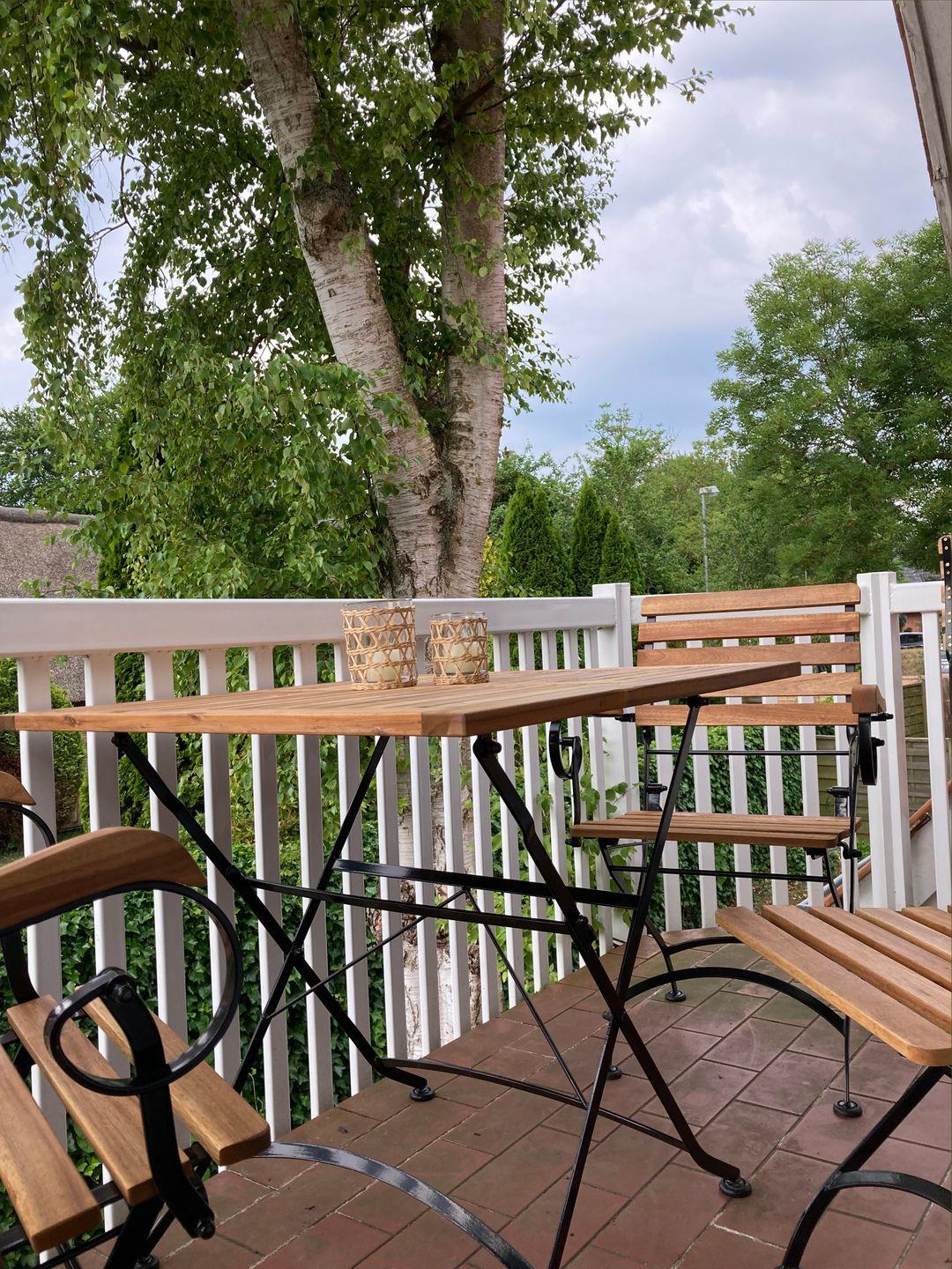 Den schönen, möblierten Südbalkon zur Gartenseite des Hauses erreichen Sie ebenfalls vom Wohnzimmer.
