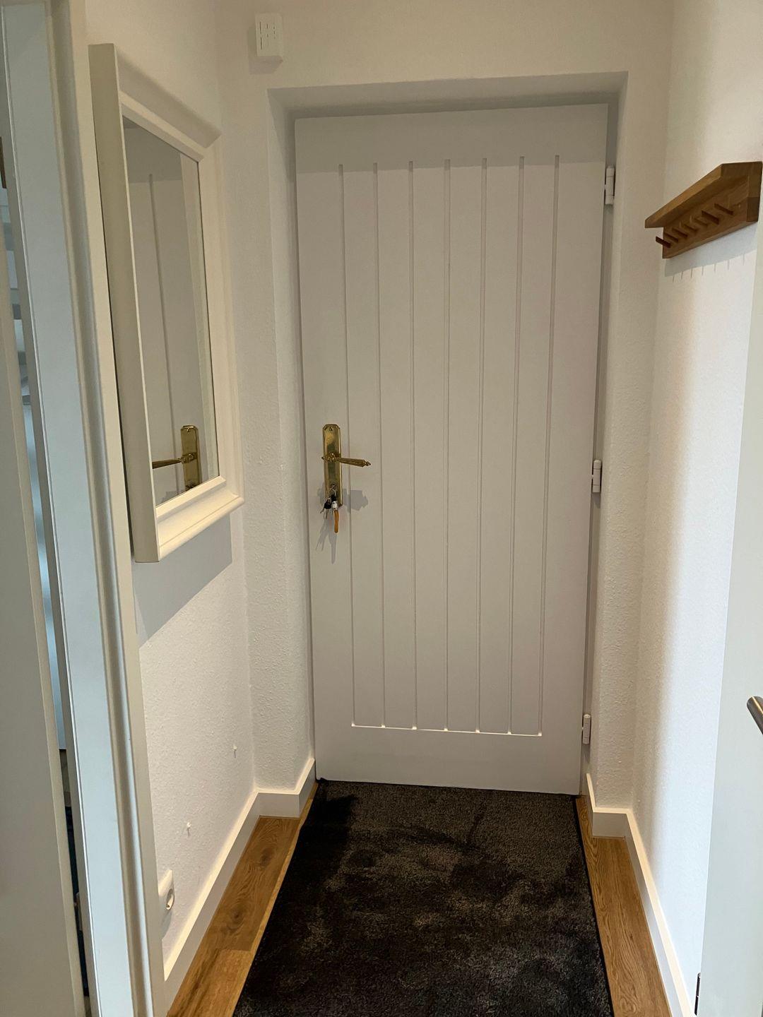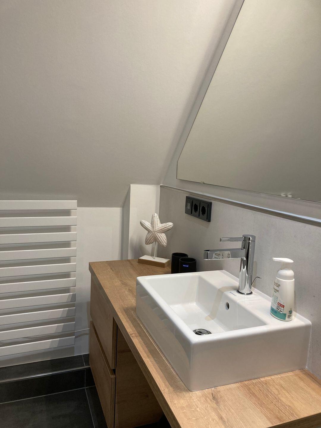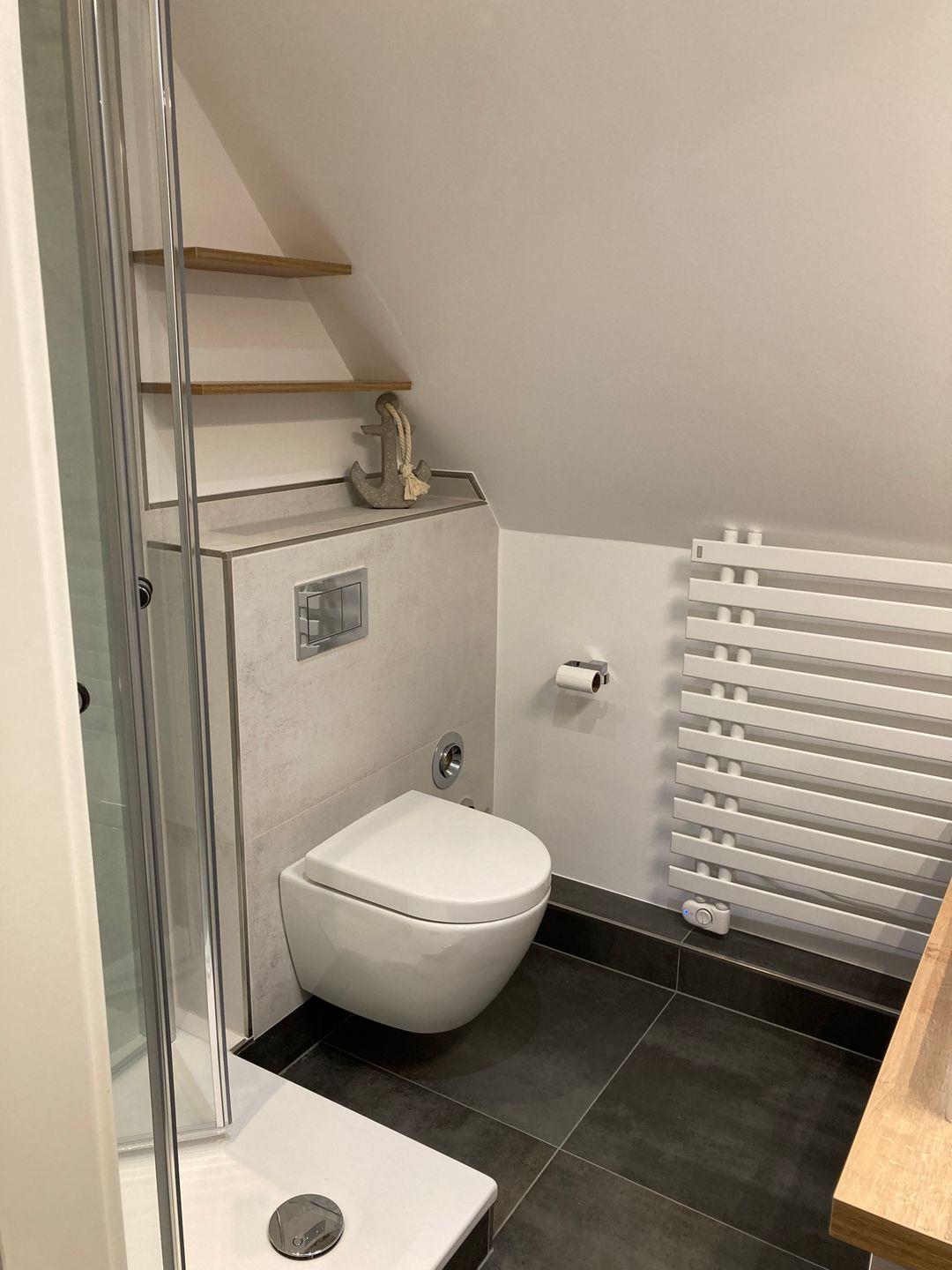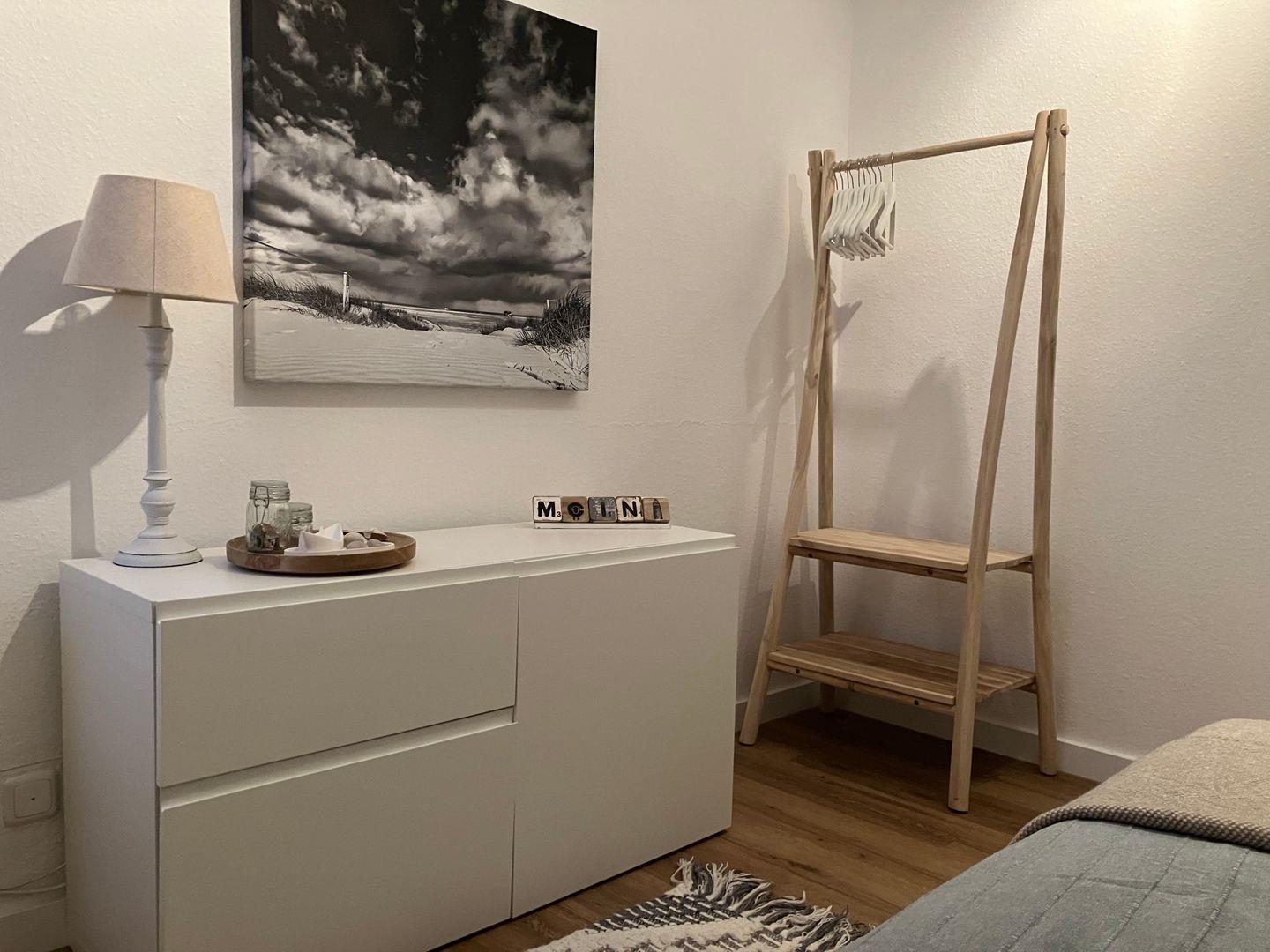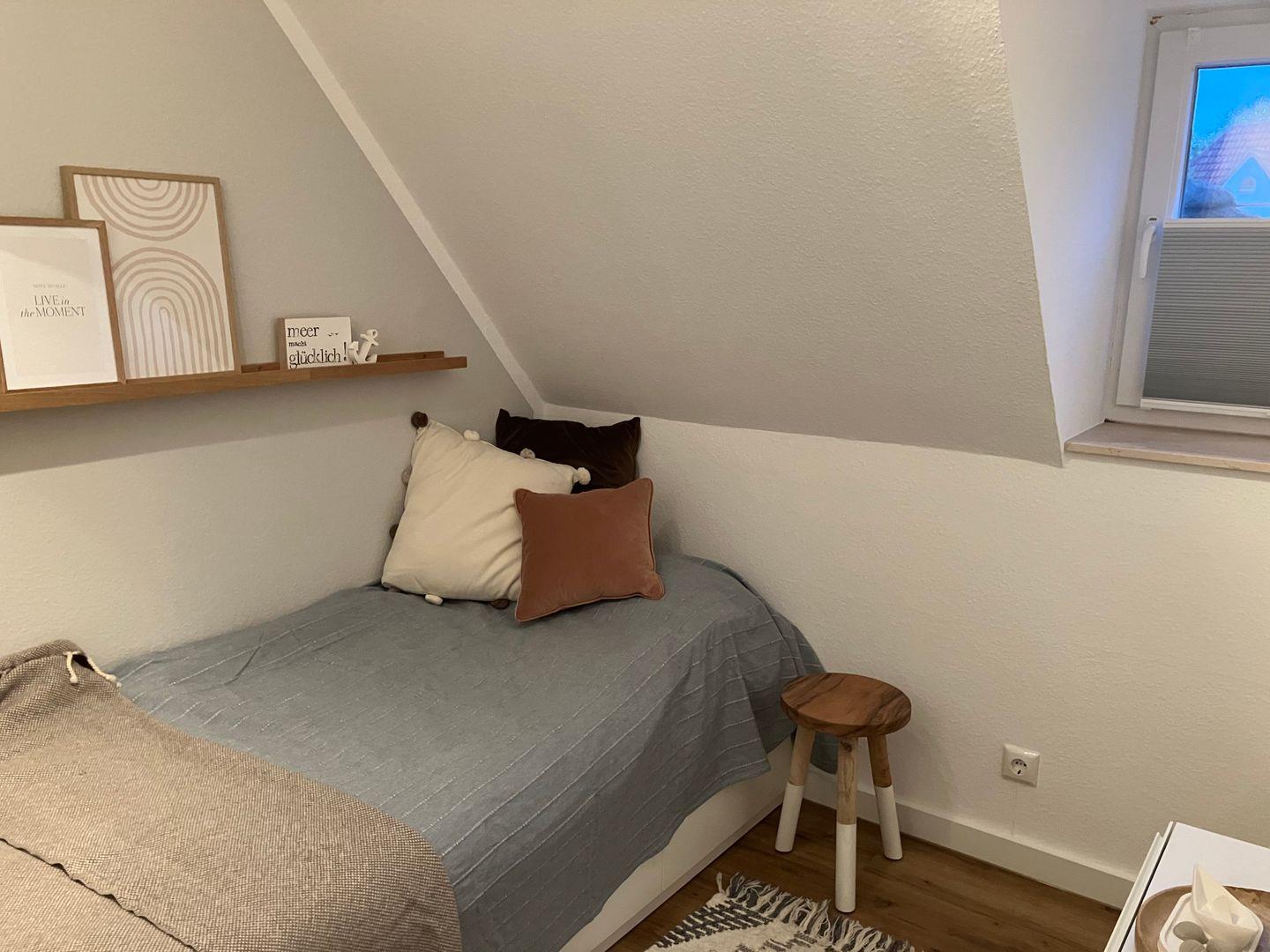 Im ersten Stock befinden sich angrenzend an einen kleinen Flur der Wohnraum, das moderne Duschbad, das 2023 komplett renoviert wurde, sowie das kleinere der beiden Schlafzimmer, ausgestattet mit einem Einzelbett mit hochwertiger Matratze.