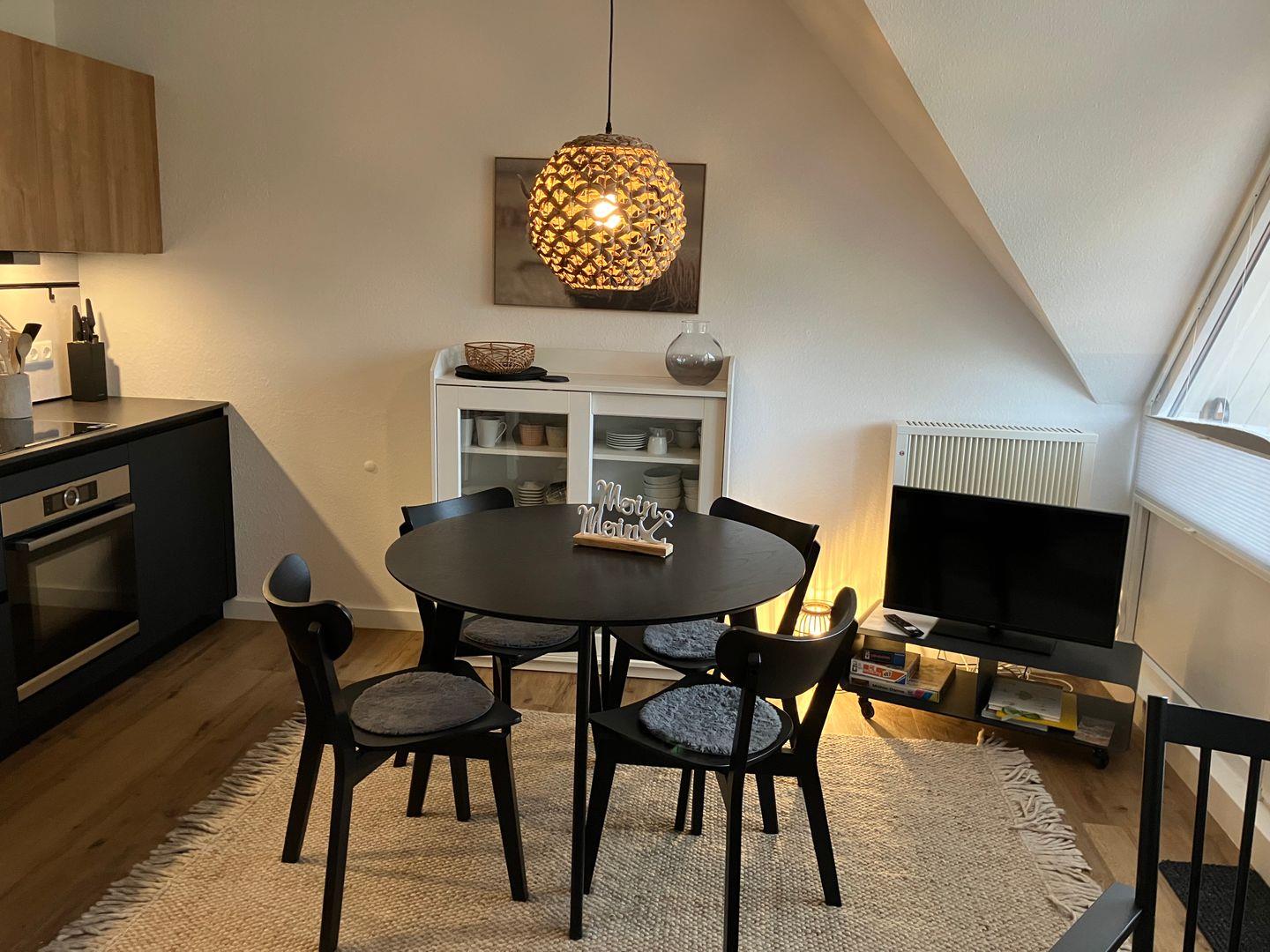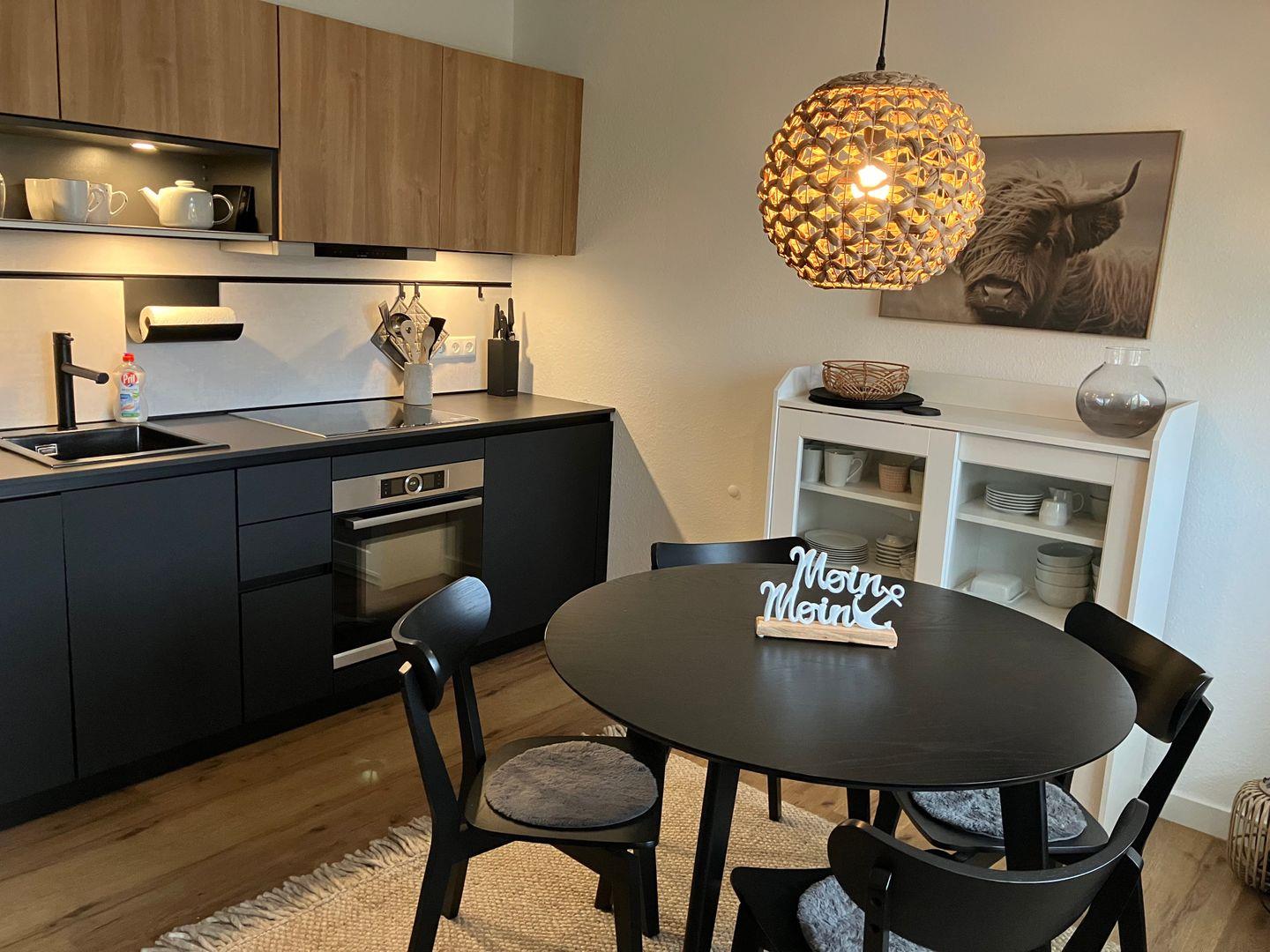 Die voll ausgestattete Küchenzeile wurde 2024 neu eingebaut und ist mit Induktionsherd, Backofen mit integrierter Mikrowelle und Geschirrspüler ausgestattet. Daneben gibt es einen Essbereich sowie eine gemütliche Sitzecke, die zum Entspannen einlädt. Fernseher und WLAN gehören ebenfalls zur Ausstattung.