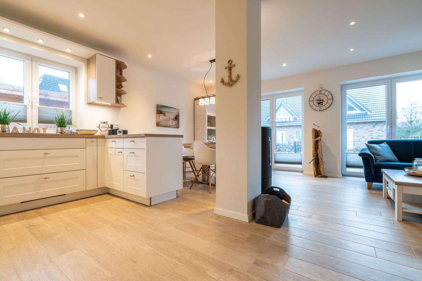 Das Feriendomizil erstreckt sich über ca. 115 qm und verteilt sich auf zwei Etagen. Es ist hochwertig und sehr komfortabel im maritimen Stil ausgestattet, inklusive Fußbodenheizung und schnellem WLAN.