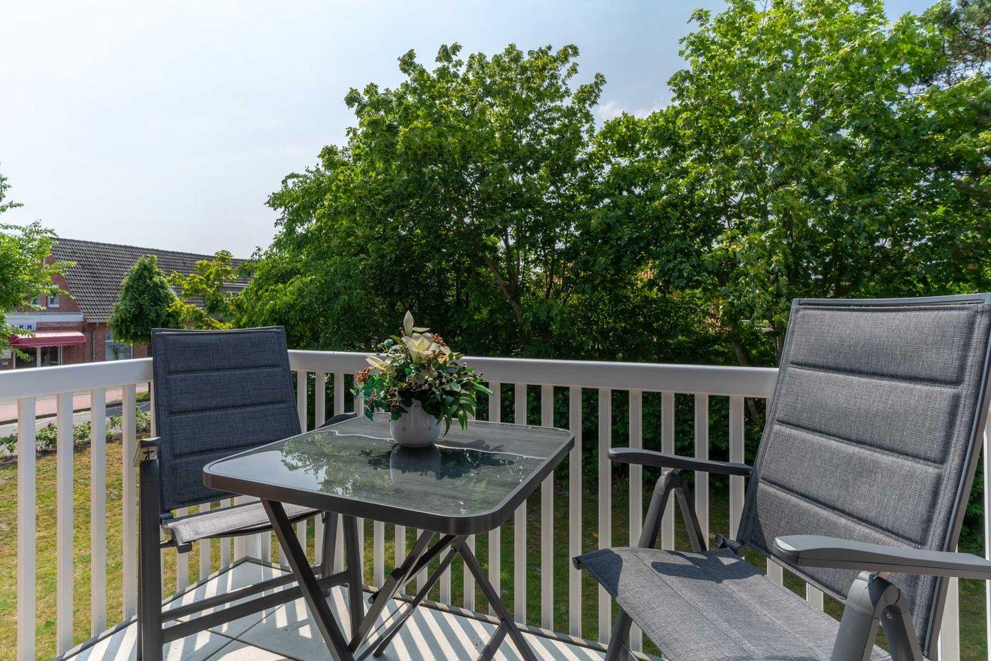 Auf dem Balkon mit Gartenmöbeln lassen Sie den Urlaubstag ausklingen. Ein PKW-Stellplatz und ein Fahrradständer gehören ebenfalls zur Ferienwohnung.