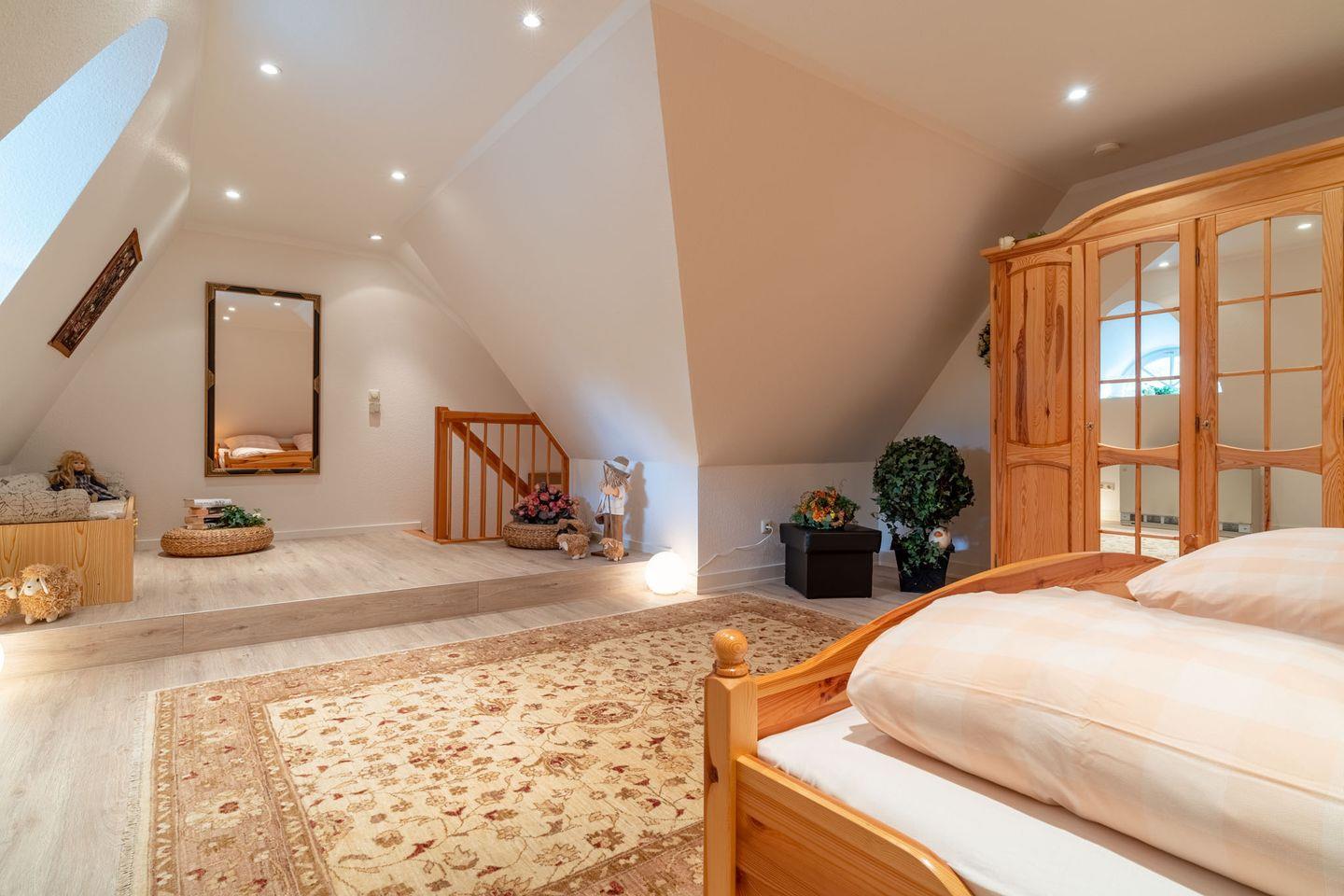 Auf der gleichen Etage befindet sich ein Duschbad und ein Schlafzimmer mit Einzelbetten. Ein weiterer Schlafbereich mit Doppelbett befindet sich im Dachgeschoss.