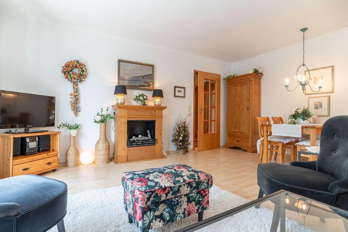 Schöne Wohnung in einem Reetdachhaus im Ortsteil Dorf. Dorfzentrum mit Restaurants und Einkaufsmöglichkeiten in wenigen Gehminuten erreichbar. Zum Seedeich mit Strandübergang ca. 15 Minuten zu Fuß. Die ca. 75 qm große Wohnung liegt im ersten Obergeschoss. 1 Schlafraum (2 Einzelbetten), separate Einbauküche mit Geschirrspüler, Backofen, Bad mit Dusche, Föhn. Wohnraum mit Essecke, Flachbildschirm, Balkon in Süd-West-Lage. Im Dachgeschoss befindet sich ein weiterer Schlafraum mit Doppelbett. NICHTRAUCHERHAUS!! Keine Haustiere. PKW-Stellplatz am Haus. WLAN vorhanden.