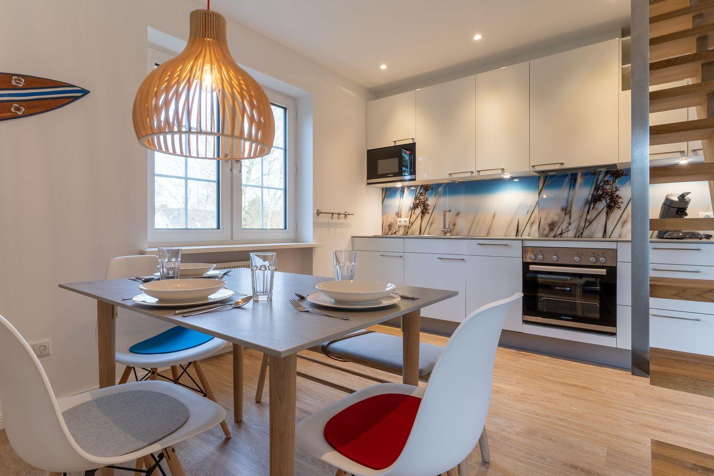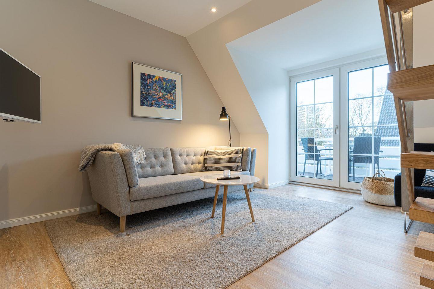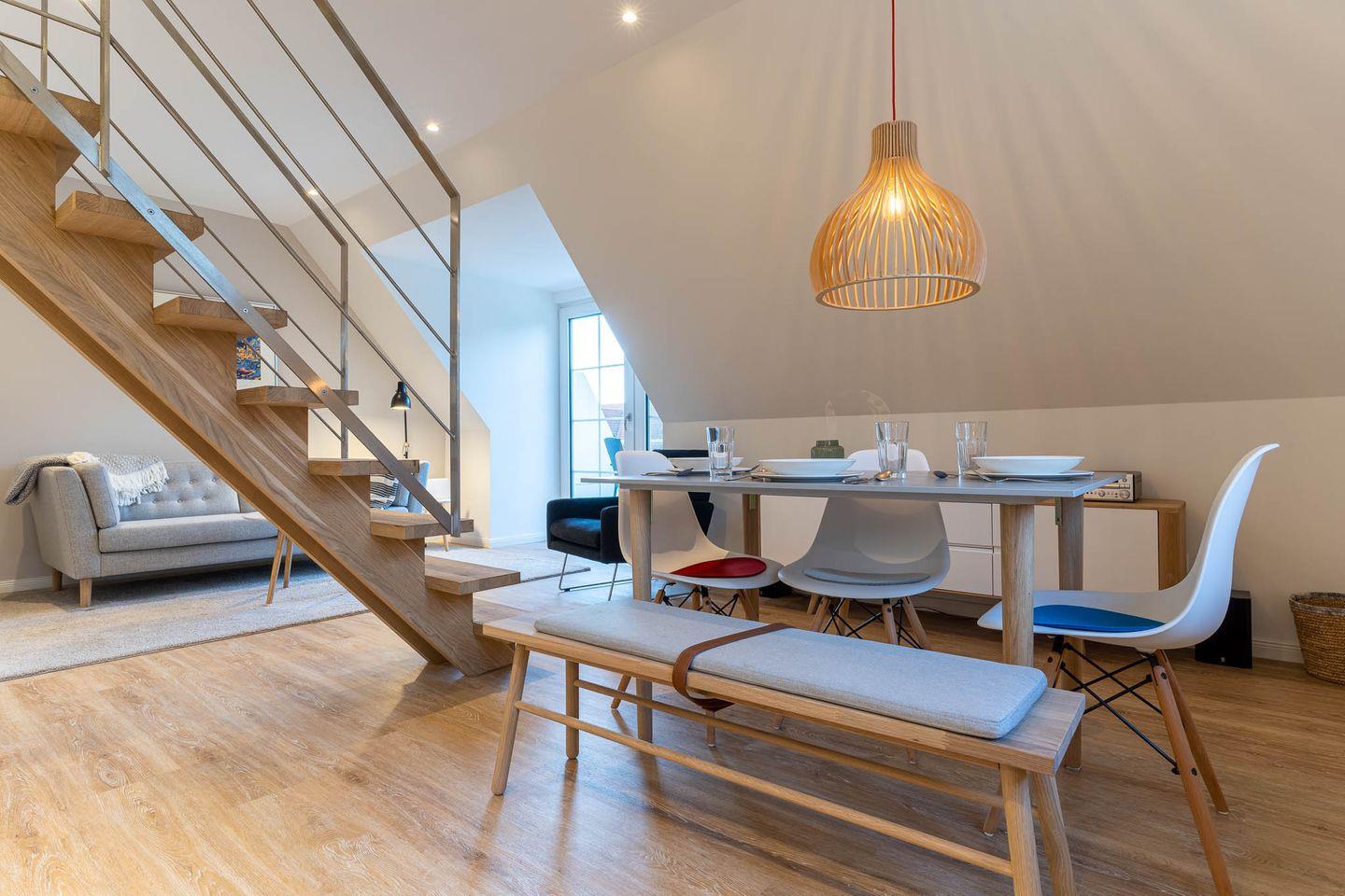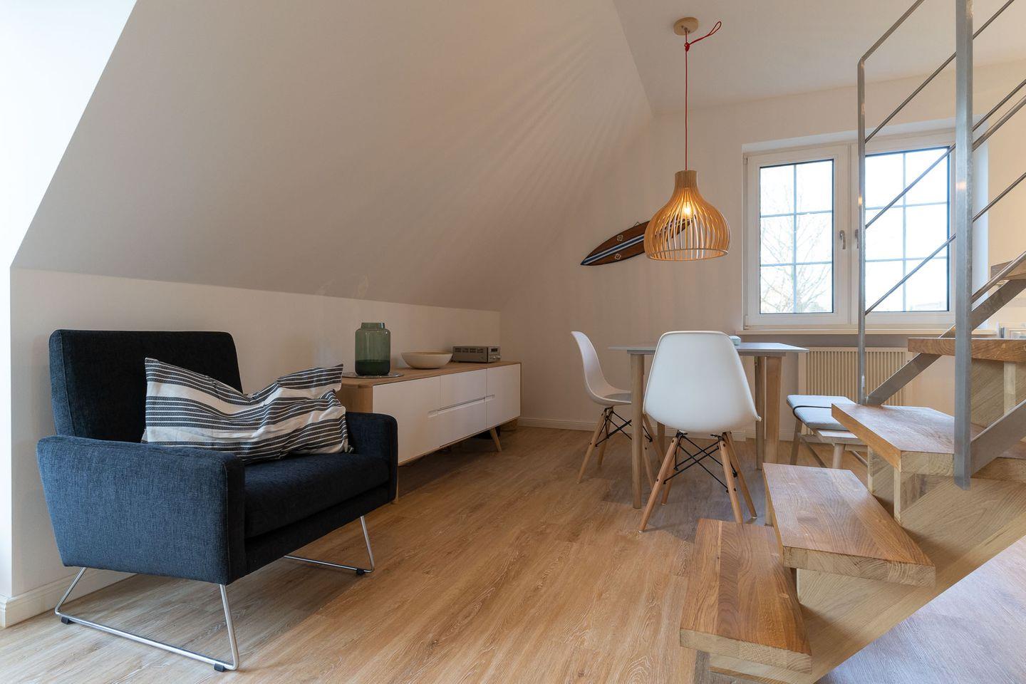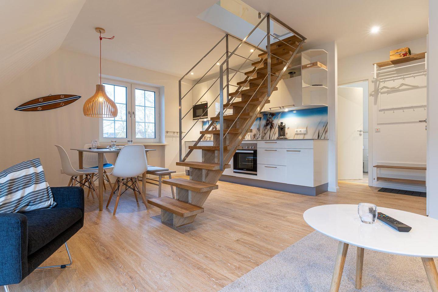 Die ca. 65 qm große Wohnung erstreckt sich über zwei Etagen. Im unteren Bereich befindet sich das moderne, gemütliche Wohnzimmer mit einem schicken Essbereich, Flachbildfernseher und einer voll ausgestatteten Küchenzeile. Ein Balkon mit Tisch und Stühlen lädt zum Verweilen ein. Das Schlafzimmer verfügt über ein Boxspringbett und einen großzügigen Kleiderschrank. Das Duschbad ist mit Fußbodenheizung ausgestattet.