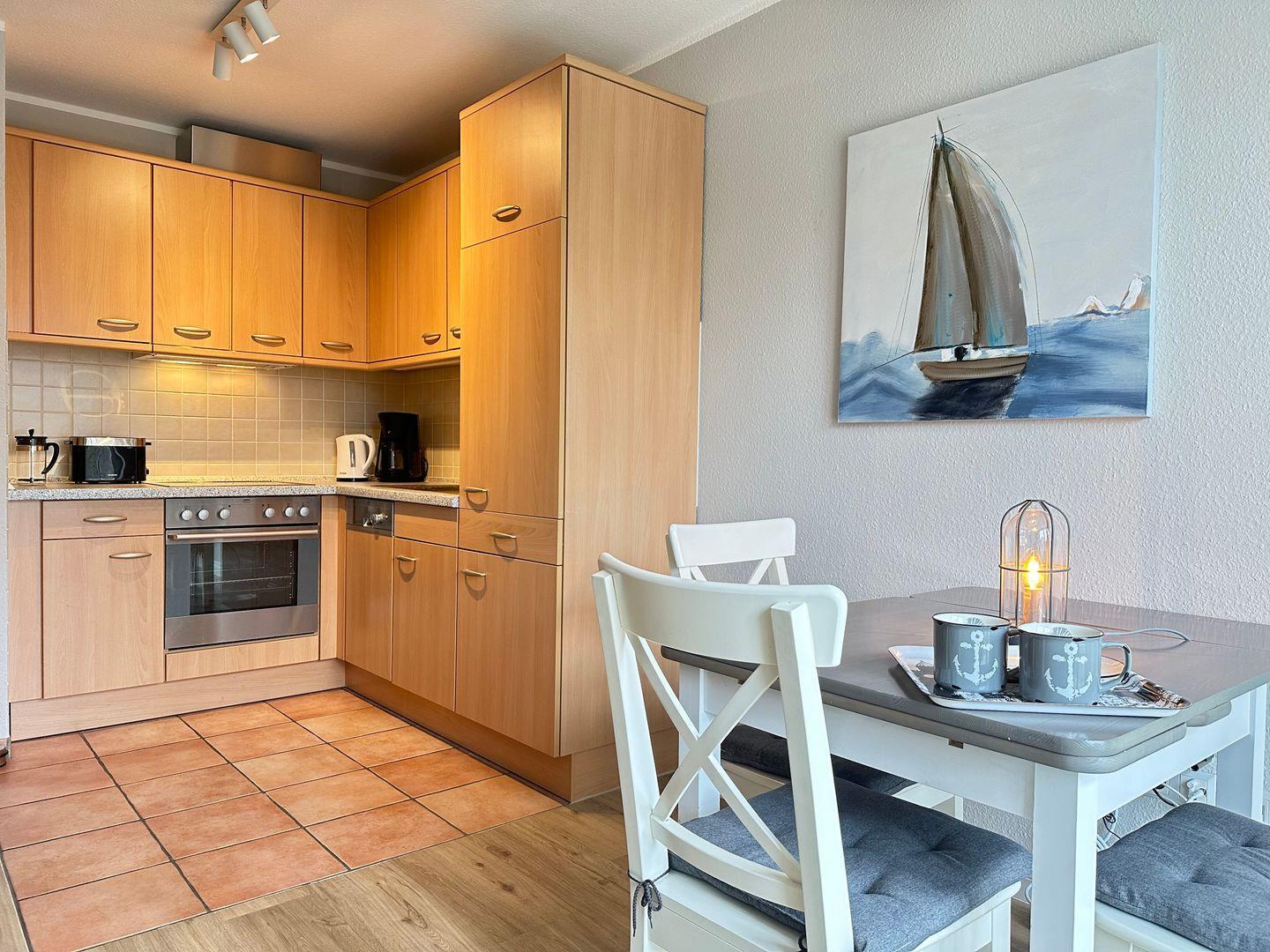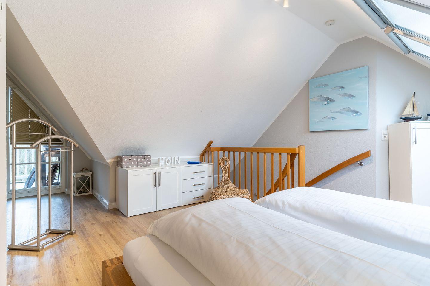 Schöne Wohnung in Friesenhaus mit mehreren Einheiten im Ortsteil Dorf. Dorfzentrum, Restaurants, Einkaufsmöglichkeiten in Gehweite. Zum Seedeich mit Strandübergang ca. 10 Minuten zu Fuß. 60 qm auf zwei Etagen. OG: 1 Schlafraum (franz. Bett 1,40 x 2,00), Wohnbereich mit offener Küche, Esstisch, Geschirrspüler, Backofen, Ceran, Bad mit Dusche, Balkon. DG: Offener Schlafbereich mit Doppelbett. NICHTRAUCHERWOHNUNG!! PKW-Stellplatz Nr. 9 am Haus. WLAN! Haustiere auf Anfrage.