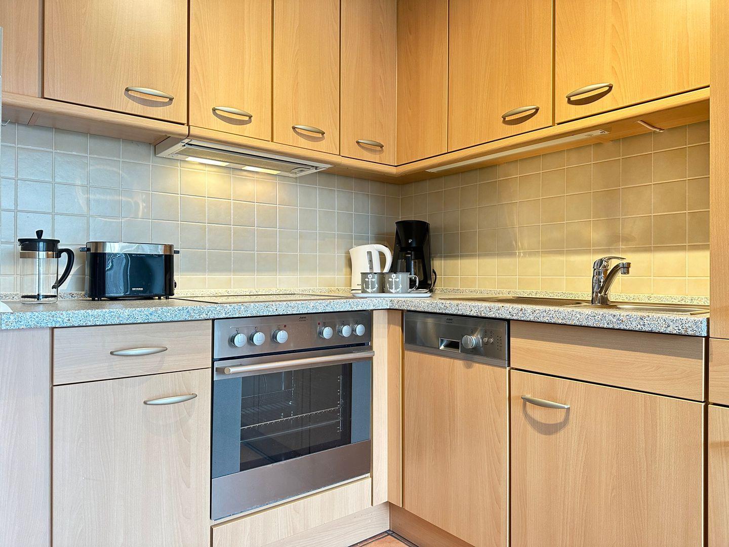 Mit zwei Schlafzimmern und einem Duschbad bietet die Wohnung ausreichend Platz. Die offene Küche ist mit Annehmlichkeiten wie Geschirrspüler, Ceran-Kochfeld und Backofen ausgestattet. Vom Wohnzimmer aus gelangen Sie auf den Balkon und über eine Treppe ins Dachgeschoss zum zweiten Schlafzimmer.