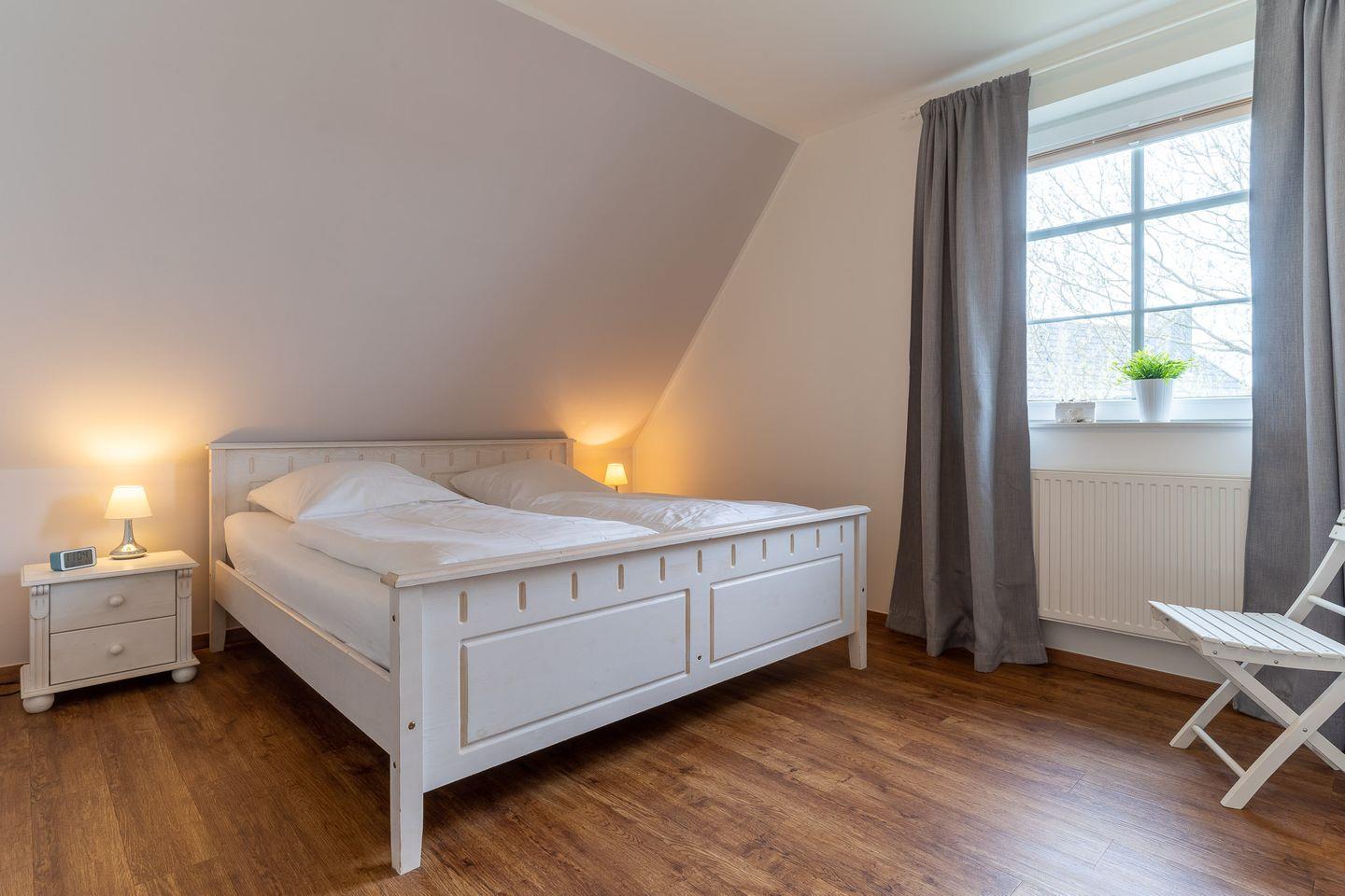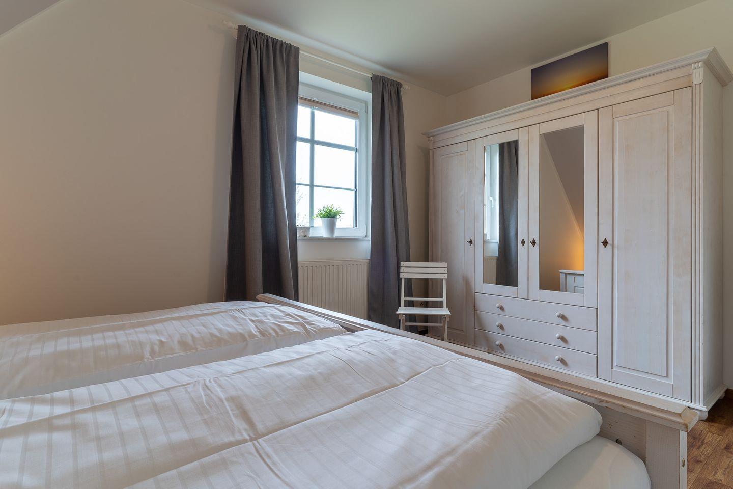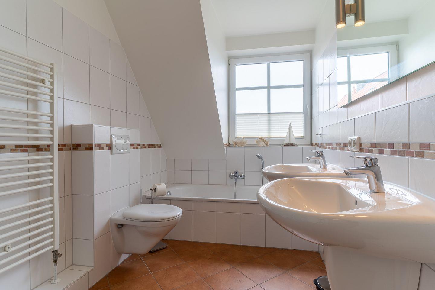 Dort finden Sie ein geräumiges Bad mit Badewanne, separater Dusche sowie 2 Waschtischen mit einem Panoramaspiegel. Das Badezimmer ist mit einer Fußbodenbegleitheizung ausgestattet. Es grenzen ein Schlafzimmer mit Doppelbett (180 x 200 cm) und geräumigem Kleiderschrank sowie ein Schlafzimmer mit zwei Einzelbetten (jeweils 90 x 200 cm) an. Kopfkissen in unterschiedlicher Größe und Fülle sind vorhanden. Bei sämtlichen Lattenrosten ist das Kopf- als auch das Fußteil höhenverstellbar. Das "Kinderzimmer" ist auch mit einem LCD-Fernseher ausgestattet, welcher sich im Kleiderschrank befindet. Jedes Schlafzimmer verfügt über einen eigenen Wecker mit Uhr. Im Flur befindet sich ein Bewegungsmelder, der Ihnen in der Nacht die Suche nach dem Lichtschalter erspart und für einen unbeschwerlichen Weg zur Toilette oder auch zur Treppe sorgt.