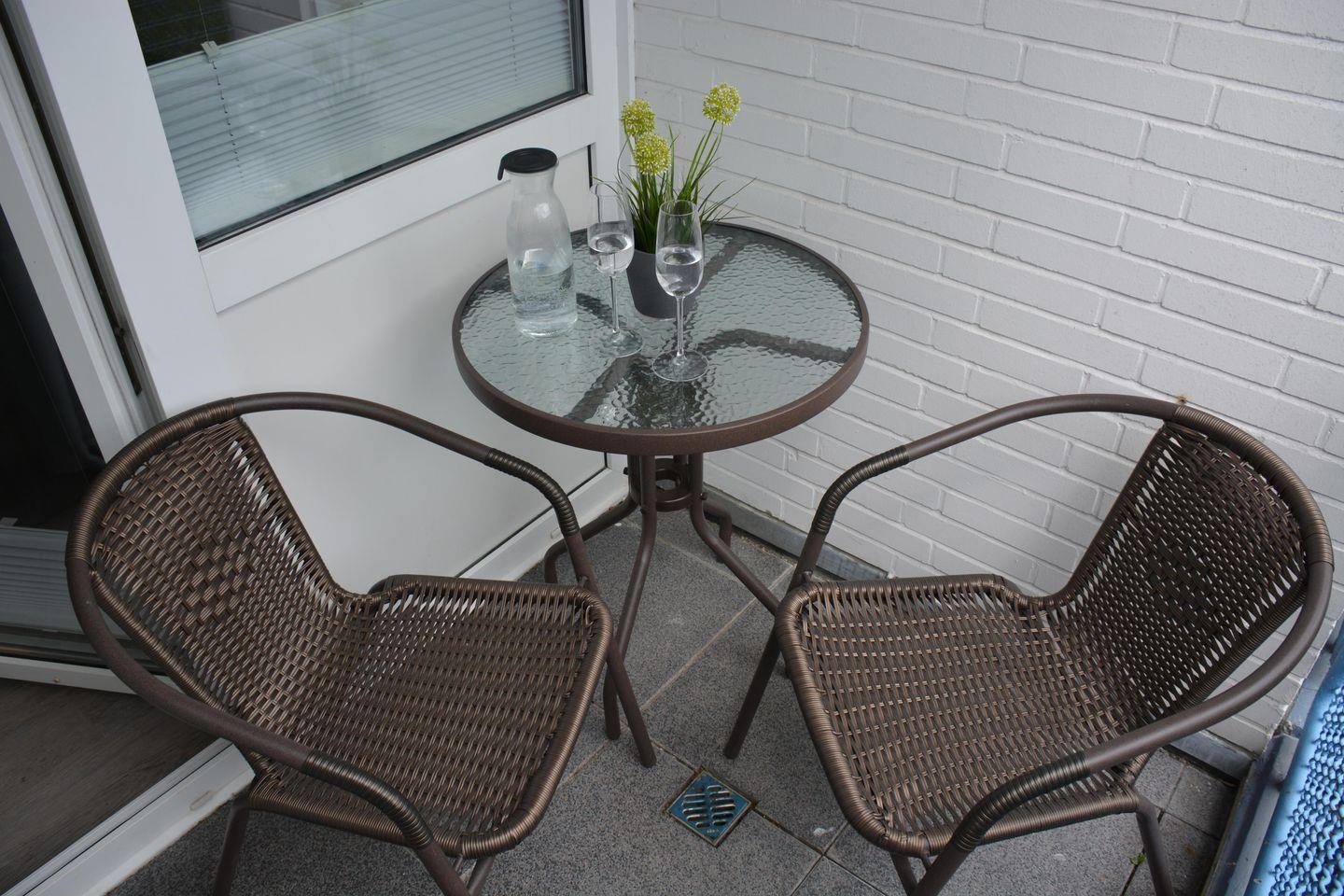 Der Balkon mit Gartenmöbeln bietet eine schöne Möglichkeit, das Frühstück oder entspannte Momente im Freien zu genießen. Die zentrale, dennoch ruhige Lage ermöglicht einen kurzen Fußweg zu Attraktionen wie der Dünentherme, der Promenade und zahlreichen Einkaufsmöglichkeiten sowie Restaurants.