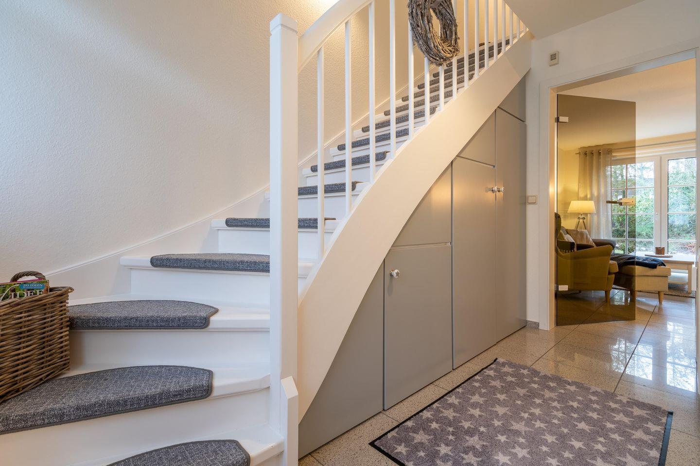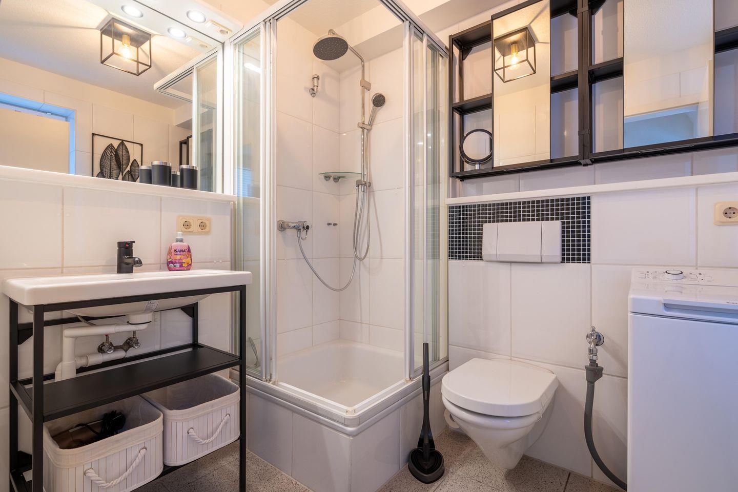 Die obere Etage verfügt über zwei Schlafzimmer, in denen Sie ruhige Nächte verbringen können. Ein Duschbad steht zur Verfügung, und eine Waschmaschine sorgt für zusätzlichen Komfort während Ihres Aufenthalts.