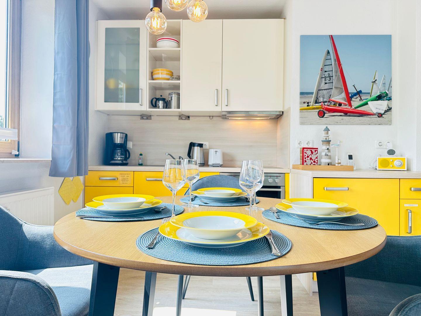 Der Wohnraum der Wohnung ist ansprechend gestaltet und verfügt über eine Essecke sowie eine offene Küche. Hier lädt eine behagliche Atmosphäre zum gemeinschaftlichen Kochen und Verweilen ein. Ein Flachbildfernseher sorgt für Unterhaltung.