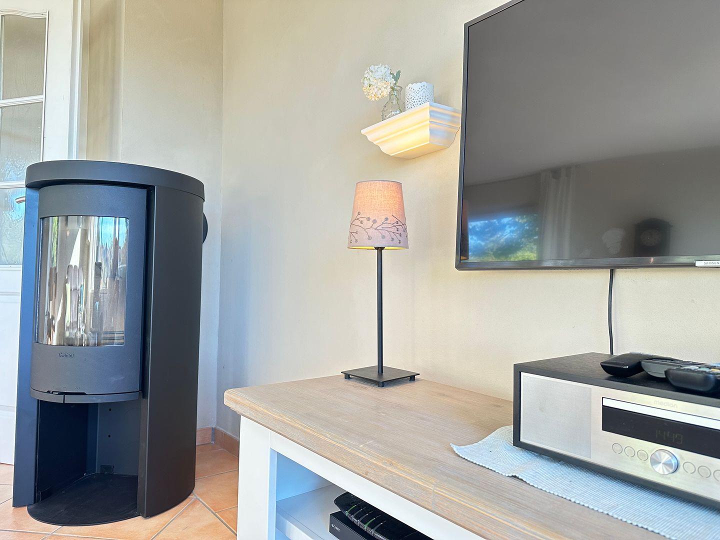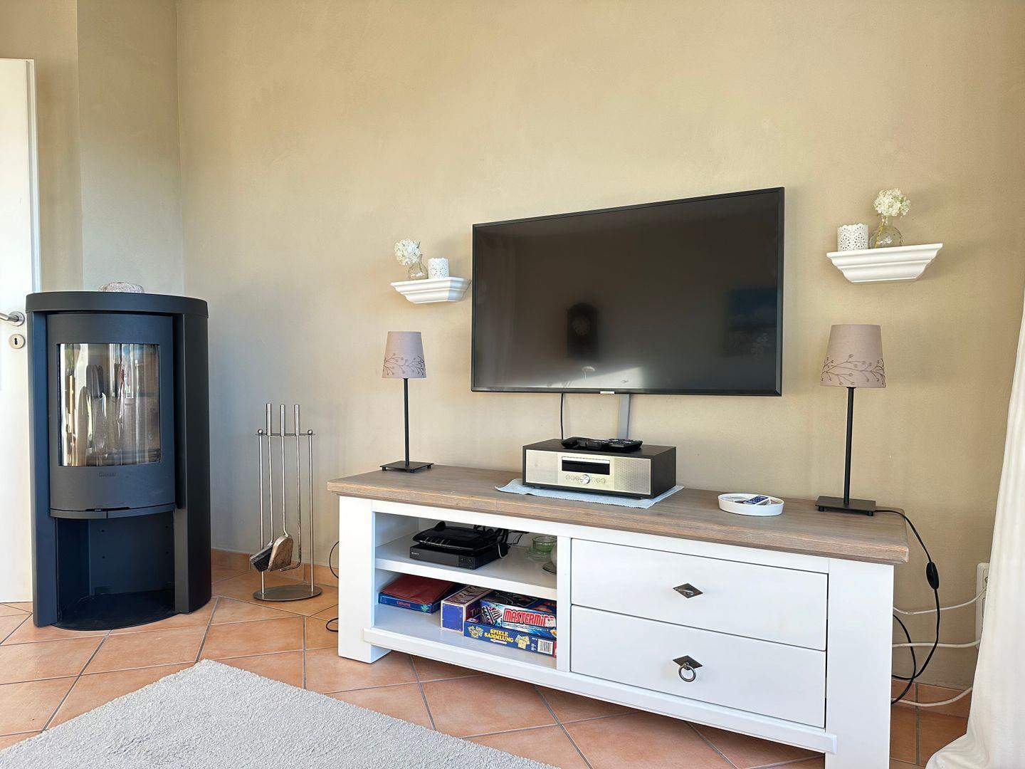Im Wohnraum mit Essecke wird es dank Kamin kuschelig. WLAN und TV sind vorhanden.