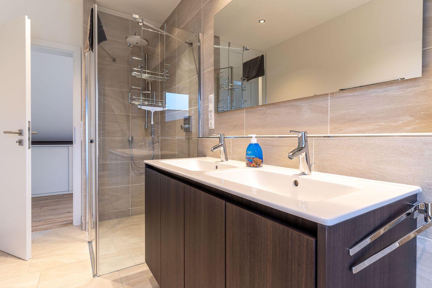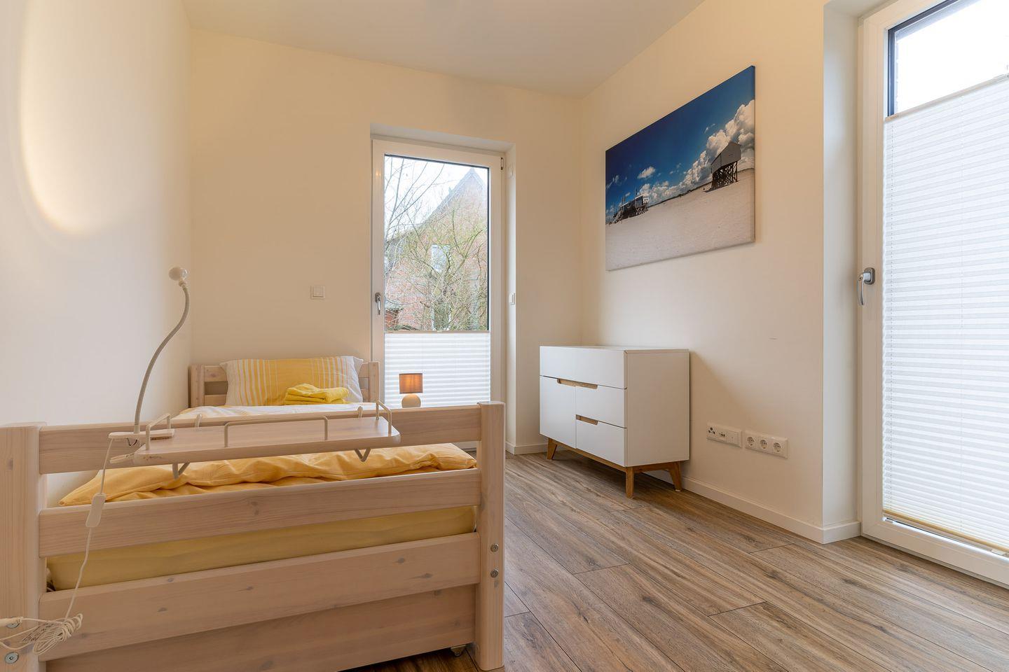 In jeder Wohnung gibt es ein gemütliches Elternschlafzimmer mit einem bequemen Doppelbett, ein Kinderzimmer mit einem Etagenbett sowie ein weiteres Zimmer mit einem Schlafsofa. Das Bad im Obergeschoss ist mit einem Doppelwaschbecken, WC, bodentiefer Dusche, einem Handtuchtrockner, einem Kosmetikspiegel und einem Fön ausgestattet. Das Duschbad im Erdgeschoss ist behindertenfreundlich und barrierefrei zugänglich.