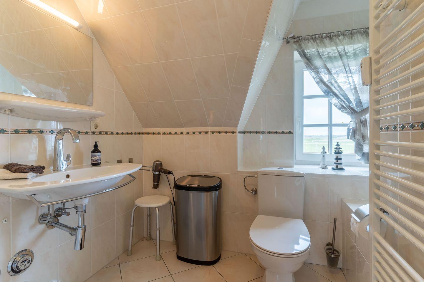 Das geräumige helle Bad mit Fenster, Waschbecken, Dusche, WC, beheizbarem Handtuchhalter und Föhn erreichen Sie vom Flur aus. Ebenfalls vom Flur aus gelangen Sie in das "Rückzugszimmer", in dem ein großes Ausziehsofa und ein Schreibtisch mit Blick zum Westerhever Leuchtturm auf Sie warten. Eine Treppe führt Sie vom Wohnraum in den oberen Teil der Wohnung, wo sich das Schlafzimmer mit Doppelbetten (2 x100 cm x 200 cm) und einem zweiten Fernseher befindet.