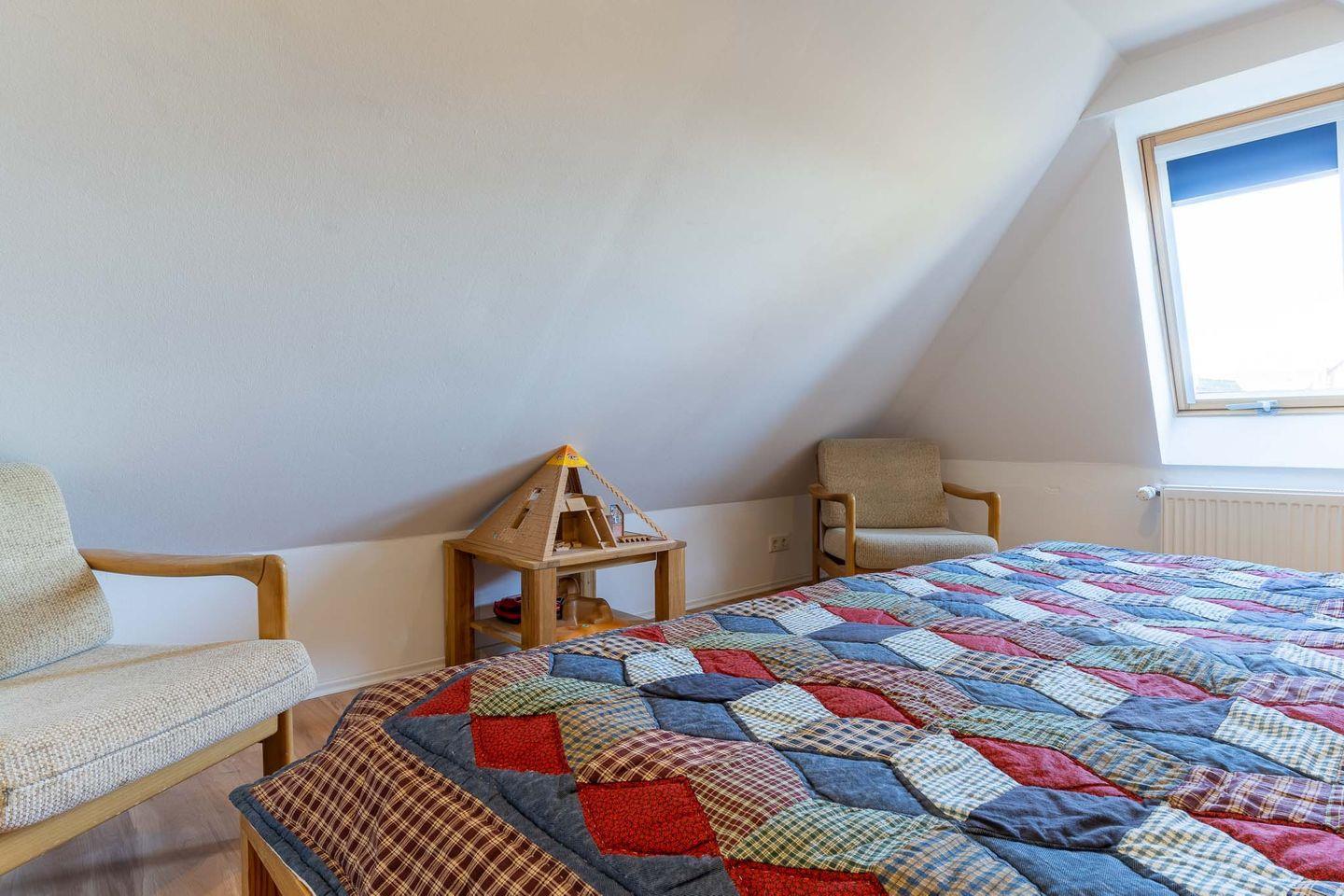 Willkommen in dieser modernen und geräumigen Ferienwohnung für vier Personen! Die Wohnung erstreckt sich über zwei Etagen und bietet einen hellen Wohnbereich mit offener Küche und zwei Balkonen, zwei geräumige Schlafzimmer, ein Badezimmer mit Badewanne und ein Gäste-Bad mit Dusche. Die voll ausgestattete Küche verfügt über alle wichtigen Geräte wie Geschirrspüler, Mikrowelle, Toaster und Kaffeemaschine. Der Wohnbereich ist mit einem Flachbildfernseher und einer Radioanlage ausgestattet und bietet Zugang zu zwei Balkonen, auf denen Sie gemütlich entspannen können. Die Wohnung hat eine Fußbodenheizung in Nussbaumoptik und ist mit hochwertigen Möbeln eingerichtet. Das Schlafzimmer auf der Hauptetage verfügt über ein großes Doppelbett und Zugang zum Balkon auf der Westseite. Das Schlafzimmer auf dem Spitzboden ist über eine kleine Treppe erreichbar und verfügt ebenfalls über ein Doppelbett. Ein eigener PKW-Stellplatz und ein abschließbarer Fahrradschuppen sind direkt vor dem Haus vorhanden. Bettwäsche und Handtücher sind im Preis inbegriffen. Die Wohnung ist tierfrei und rauchfrei. Nutzen Sie auch gerne die Waschmaschine und den Trockner, die mit den zwei anderen Wohnungen geteilt werden und über einen Euromünzenautomaten bedient werden können. Entdecken Sie die Schönheit der Umgebung und verbringen Sie hier einen unvergesslichen Urlaub!