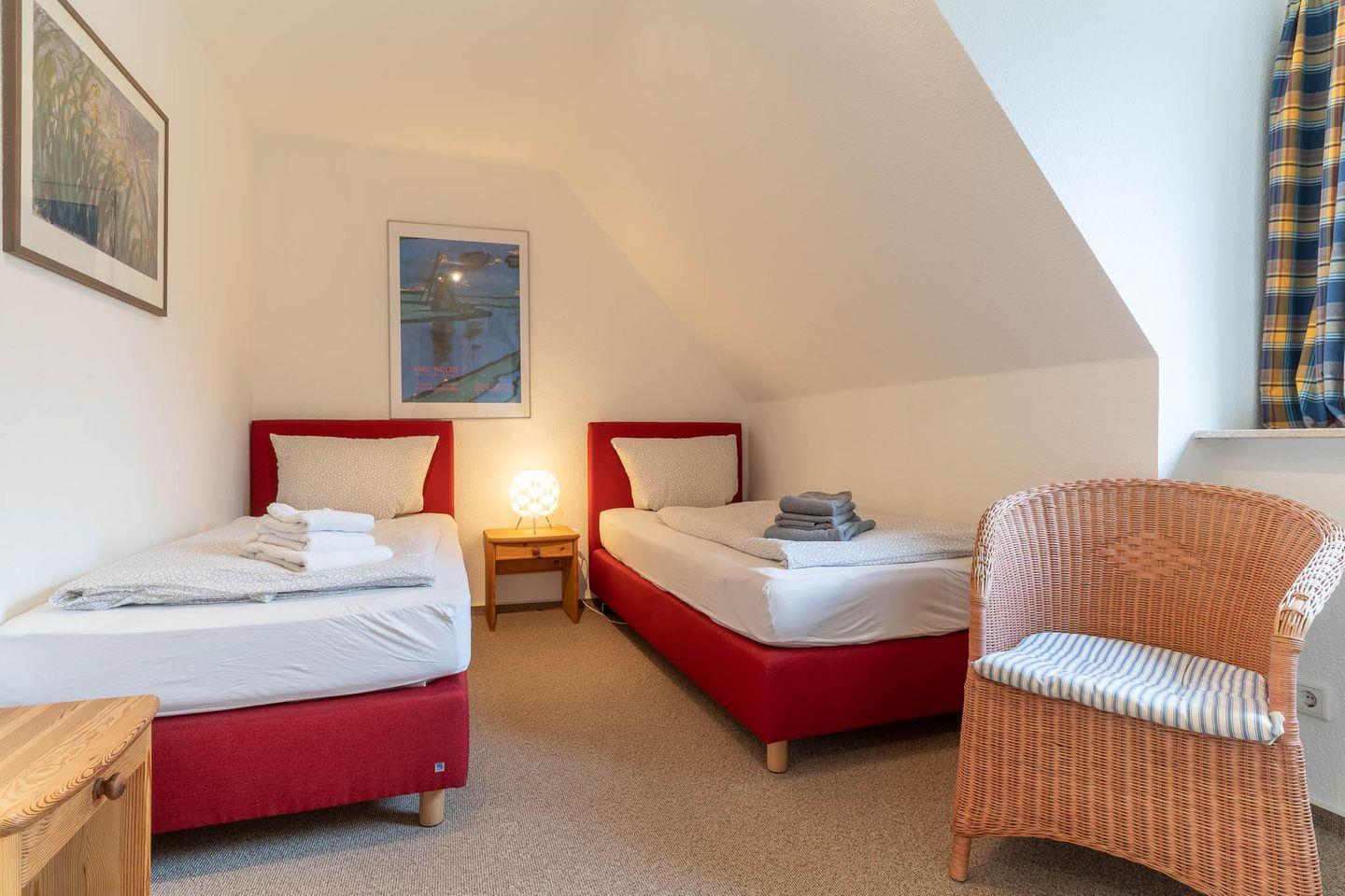 Über eine Treppe erreichen Sie das Elternschlafzimmer im Obergeschoss, das mit einem komfortablen Doppelbett (180 x 200cm), einer Sitzecke mit Korbsessel ausgestattet ist. Ein weiterer Schlafraum bietet Platz für zwei weitere Personen und ist mit zwei Einzelbetten (100 x 200cm) ausgestattet. Eine weitere Treppe höher befindet sich der dritte Schlafraum mit einem weiteren bequemen Doppelbett (180 x 200cm) und einem traumhaften Blick auf den Deich und die Dünen.