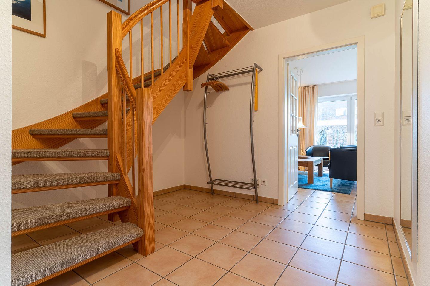 Unsere geräumige 90qm-Komfortwohnung bietet Platz für bis zu 6 Personen und erstreckt sich über drei Etagen. Die Wohnung ist hell und freundlich eingerichtet und verfügt im unteren Bereich über einen komplett gefliesten Boden, während die oberen Räume mit Teppichböden ausgestattet sind. Im gemütlichen Wohnraum erwartet Sie eine geschmackvolle Ledergarnitur sowie Unterhaltungselektronik wie Sat-TV, Radioanlage und DVD-Player.