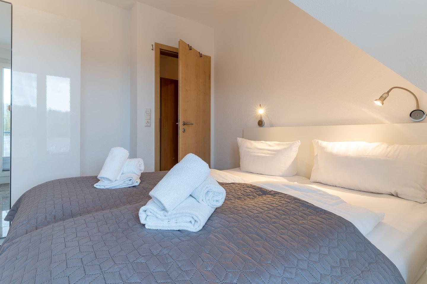 Die offene Wohnküche ist komplett ausgestattet und bietet alles, was Sie für eine angenehme Selbstversorgung benötigen. Sie verfügt über einen Backofen mit Cerankochfeld, eine Mikrowelle, einen Geschirrspüler und einen Kühlschrank mit Gefrierfach. In den beiden Schlafzimmern finden Sie ein Doppelbett (2x80x200cm im Obergeschoss) und ein großes Doppelbett (2x90x200cm im Dachgeschoss) sowie Kleiderschränke und Zugang zu zweien der drei Balkone. Der Balkon im Dachgeschoss bietet Ihnen eine herrliche Aussicht und ist nach Nordwesten ausgerichtet. Hier können Sie die Abendsonne genießen.