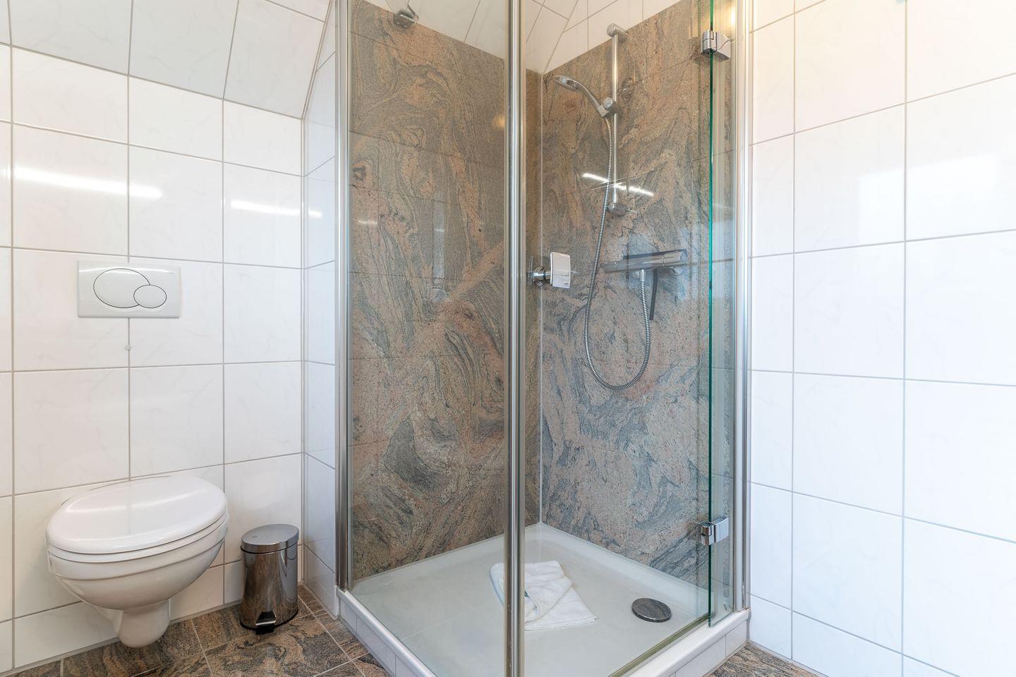 Im Obergeschoss befindet sich auch das Badezimmer mit einer Dusche und einem bodennahen Einstieg sowie einem WC und einem Föhn. Ein kleines WC mit Waschbecken befindet sich ebenfalls im Dachgeschoss und bietet Ihnen Zugang zum dritten Balkon der nach Nordwesten ausgerichtet ist.