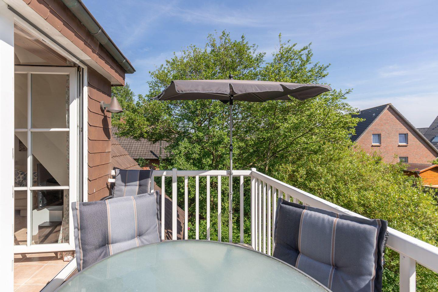Bei gutem Wetter lockt der möblierte Balkon zu Sonnenstunden im Freien. Ein Sonnenschirm spendet den nötigen Schatten.