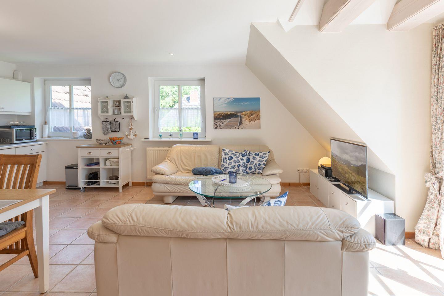 Die Ferienwohnung bietet Ihnen auf 72 qm einen Wohn-Essbereich mit offener Küche. Die Küche ist umfangreich ausgestattet mit u.a. einem Kühlschrank samt Gefrierfach, einem Herd mit Backofen, einer Mikrowelle, einem Geschirrspüler und zusätzlich zur klassischen Filterkaffeemaschine einer de Longhi Kapselmaschine. Am großen Esstisch lässt es sich wunderbar frühstücken.