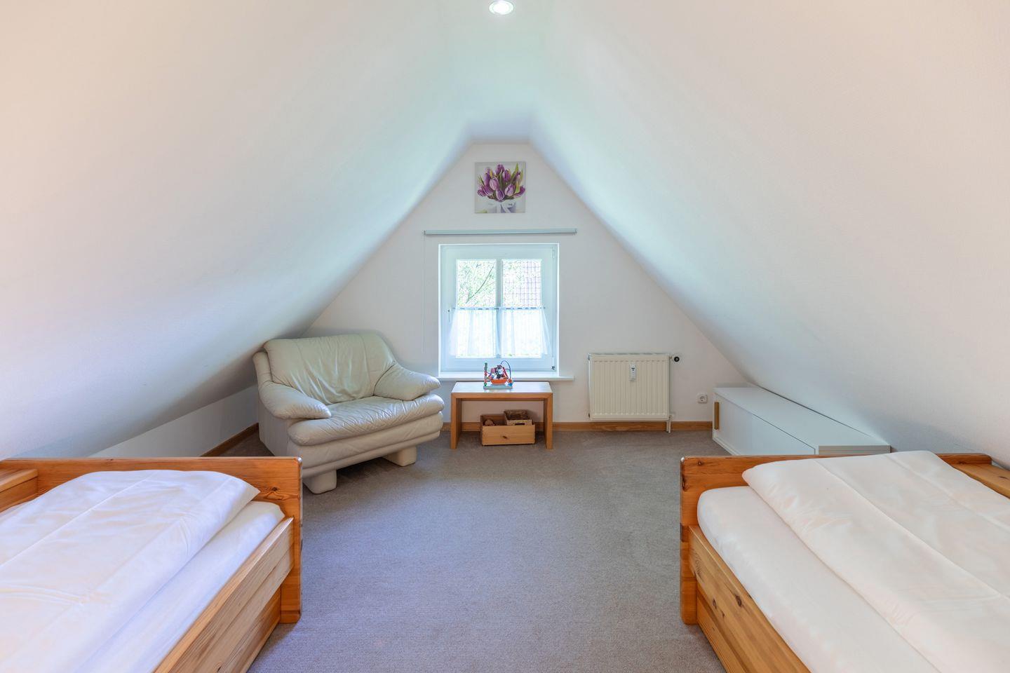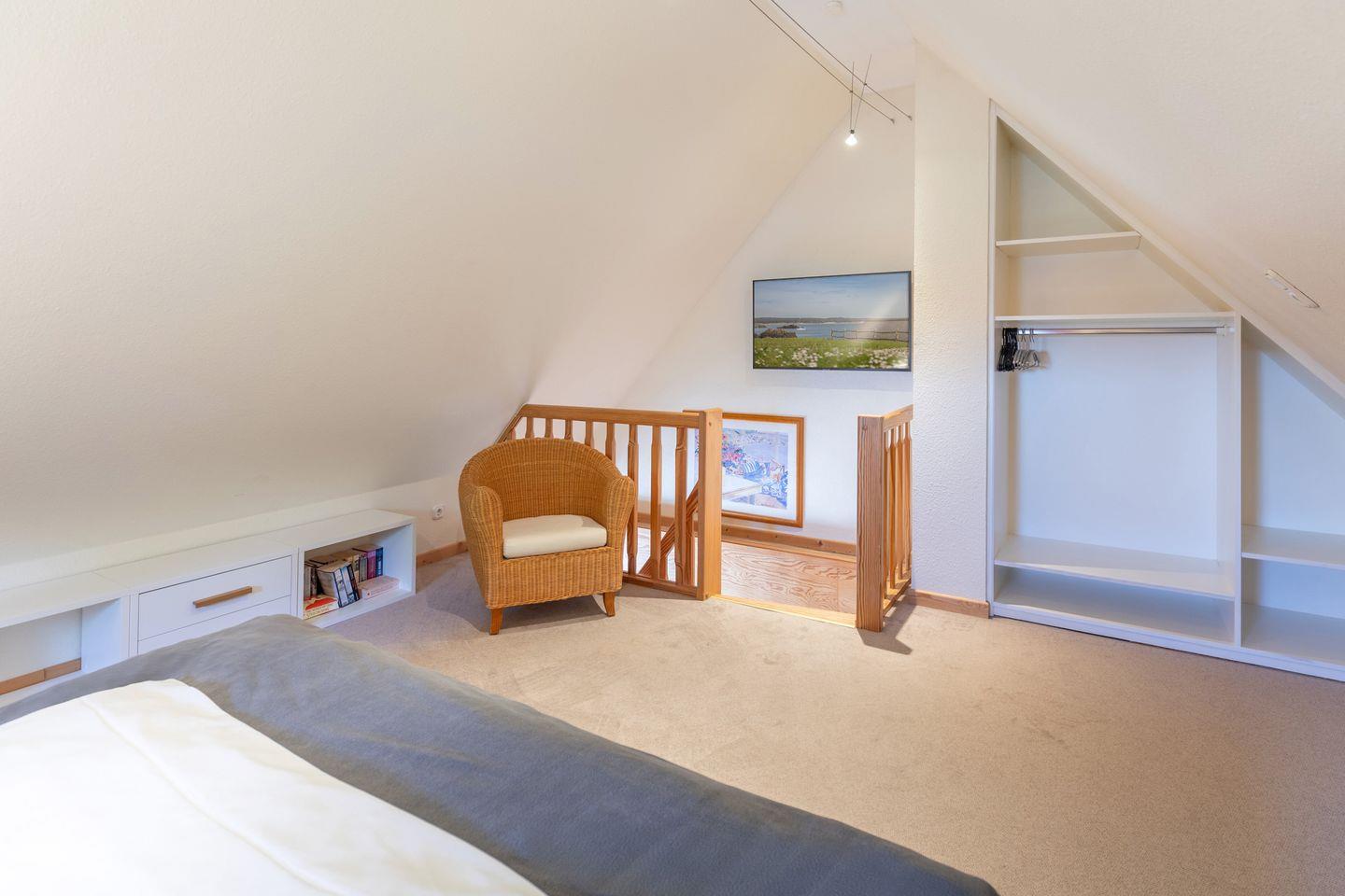 Über eine Holztreppe gelangen Sie ins Dachgeschoss. Hier befindet sich ein weiteres Schlafzimmer mit einem Doppelbett (180x200cm, getrennte Matratzen) und Fernseher, sowie einen Schrank für Ihre Urlaubskleidung.